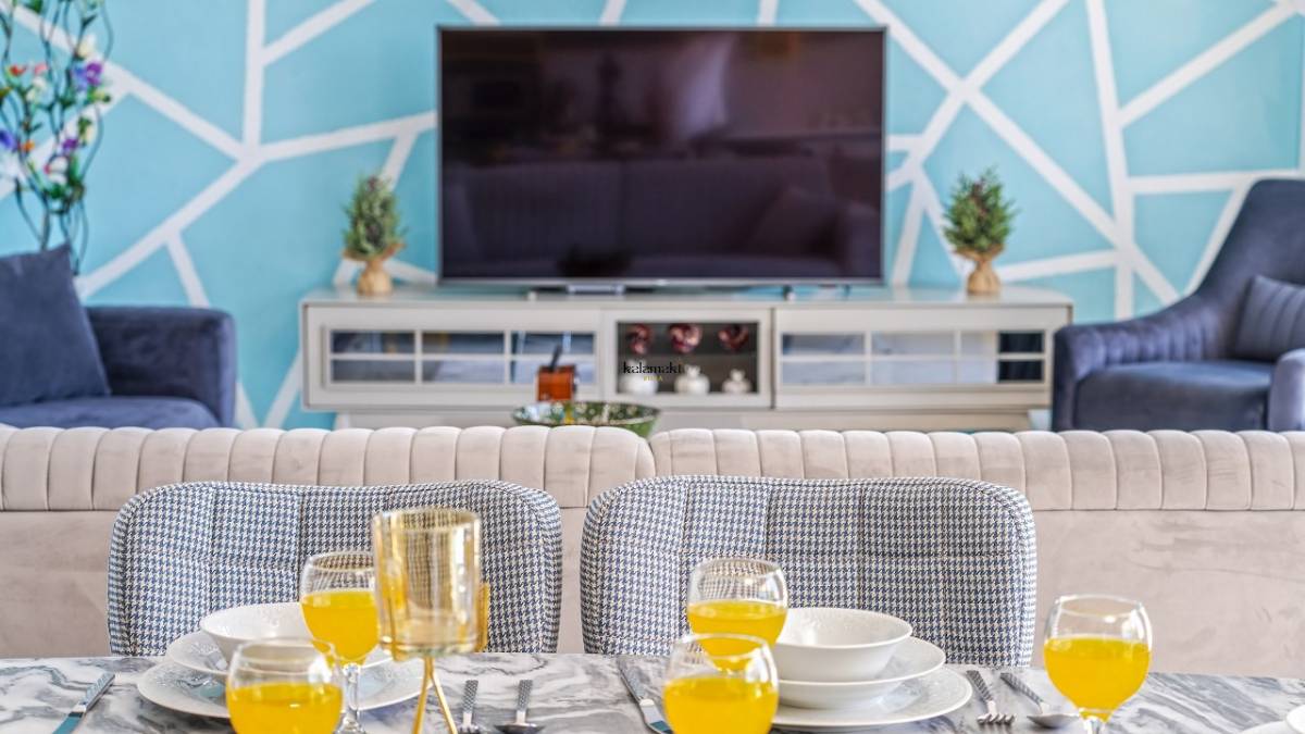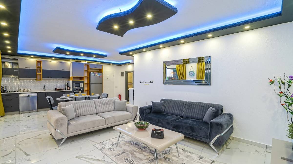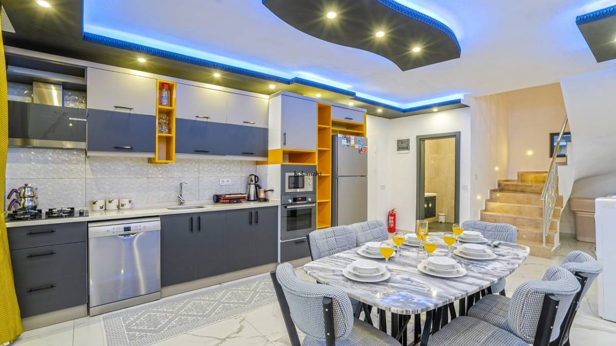 Mutfak : Modern Amerikan tarzı mutfağımızda buzdolabı, bulaşık makinesi, fırın, 4'lü ocak ve kettle bulunmaktadır. Ayrıca 8 kişilik yemek masası, yemek takımları, çatal bıçak setleri, tencere ve tava takımları ile bardaklar da mevcuttur.