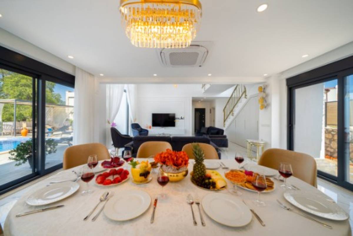 Salon: Modern oturma grubu, televizyon, klima, uydu alıcısı, orta sehpa, yemek masası, sandalyeler ve havuz terasına çıkış bulunmaktadır.