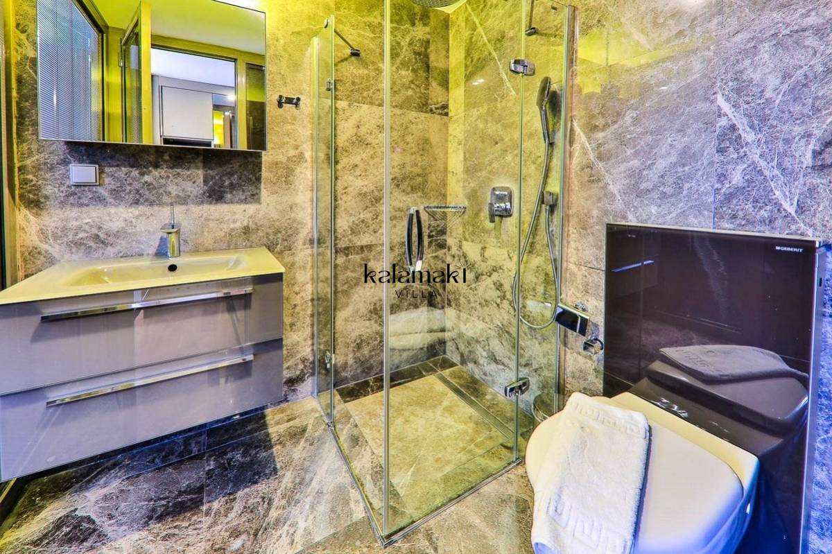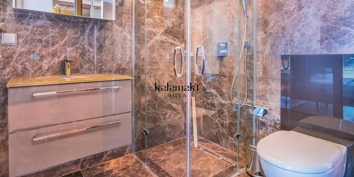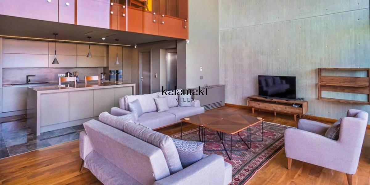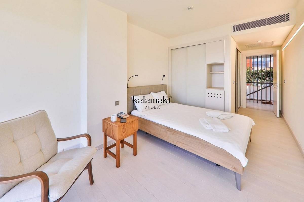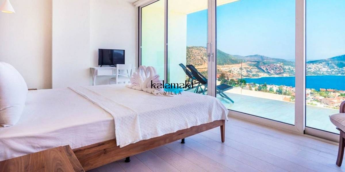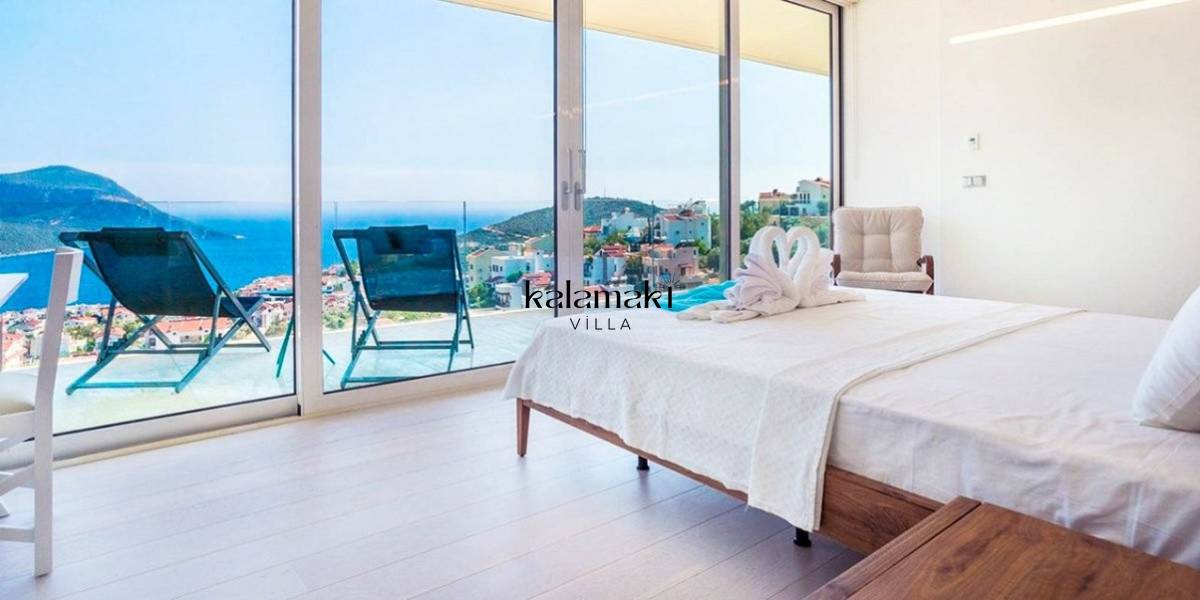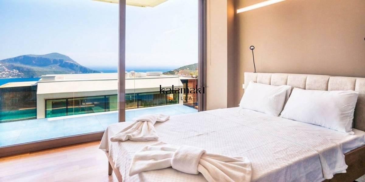 1. Yatak Odası : 1 adet çift kişilik yatak, klima, makyaj masası, komodin, elbise dolabı, banyo, küvet ve tuvalet bulunmaktadır. Deniz ve dağ manzaralı geniş terasa açılmaktadır.