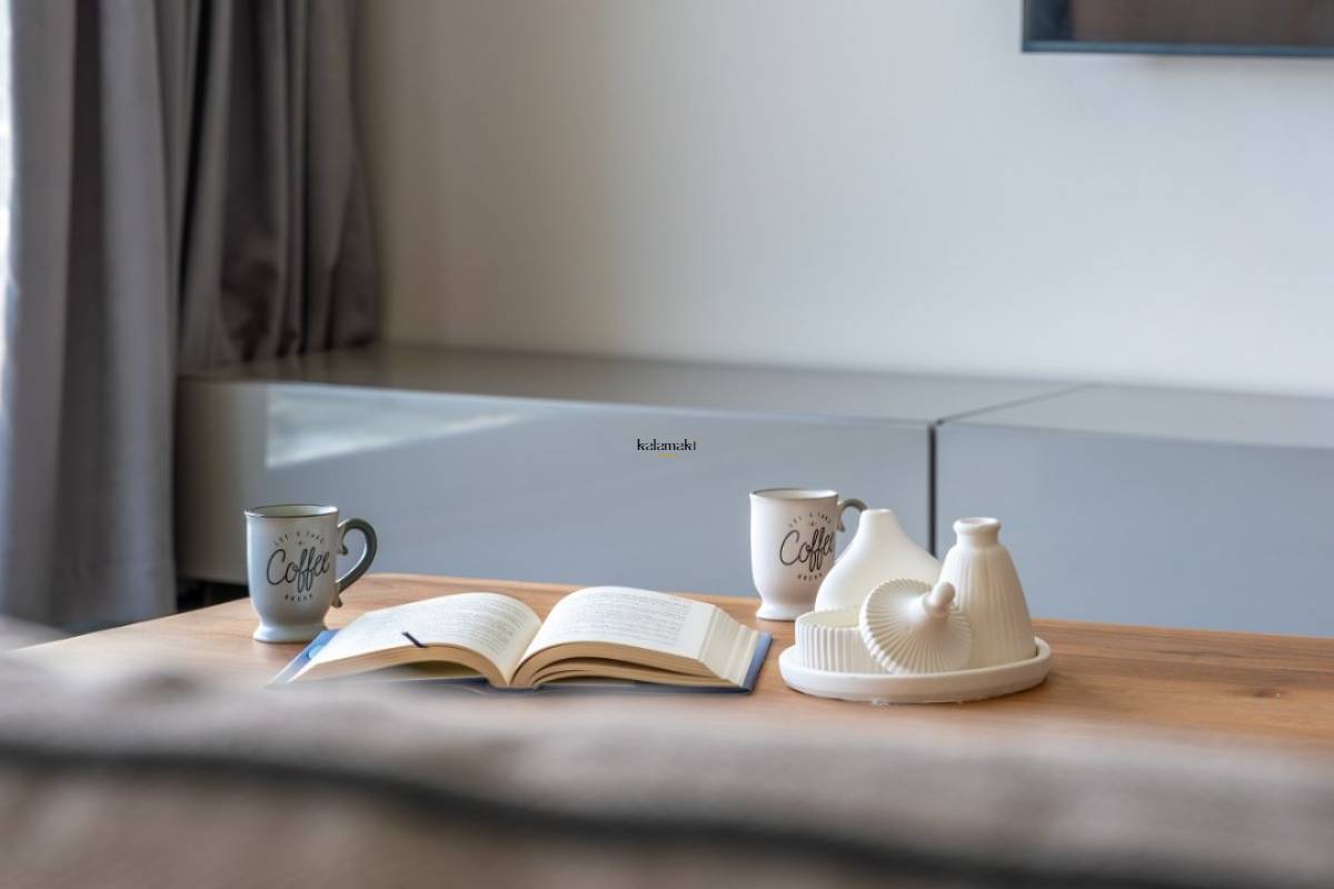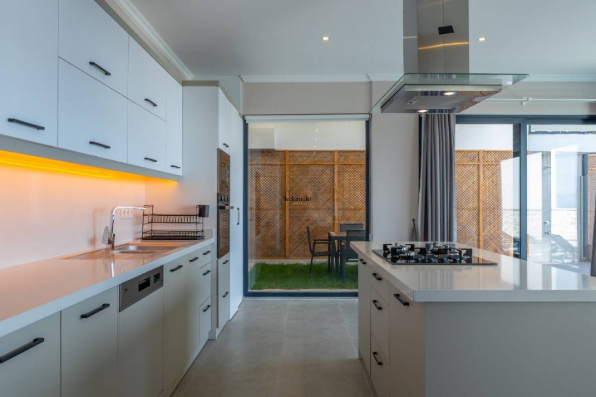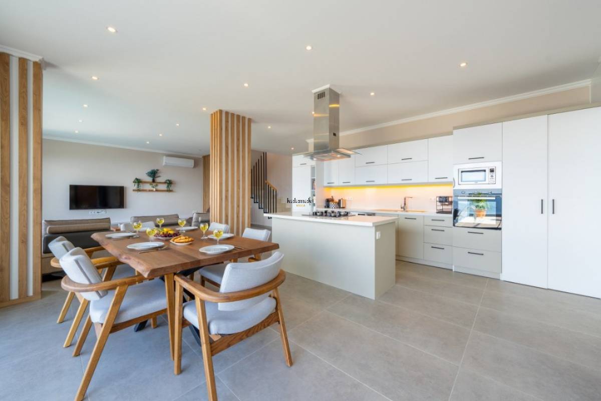 Modern Amerikan mutfak içerisinde buzdolabı, bulaşık makinesi, fırın, ocak, mikrodalga fırın, tost makinesi, yemek masası, yemek takımları, çatal ve bıçak takımları, tencere ve tava takımları, bardaklar bulunmaktadır.
