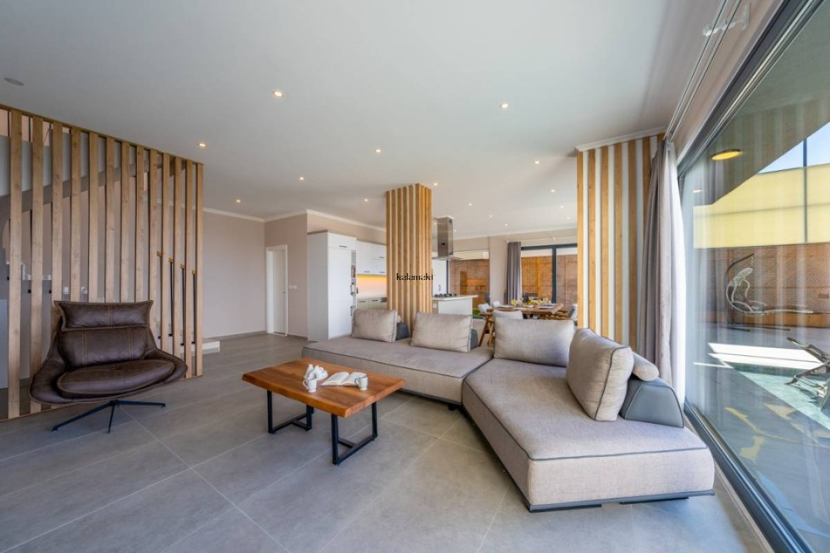 Salon içerisinde oturma grubu, TV, klima, sehpa bulunmaktadır. Havuz terasına çıkış yapılabilmektedir.
