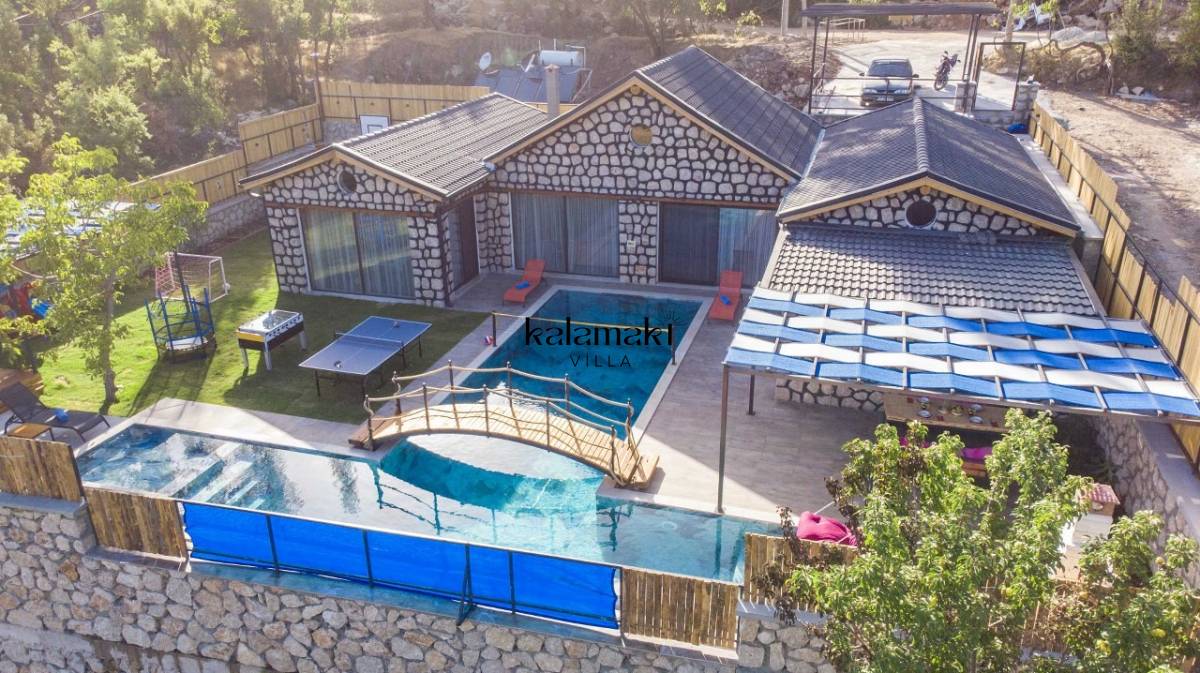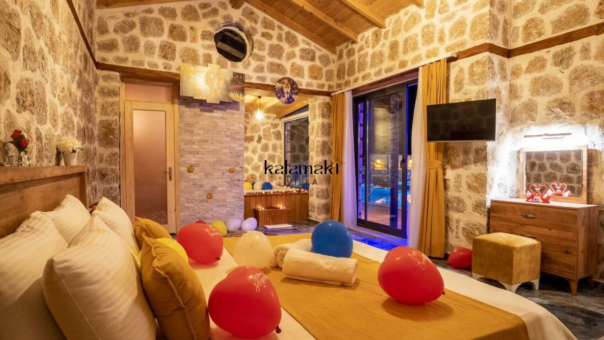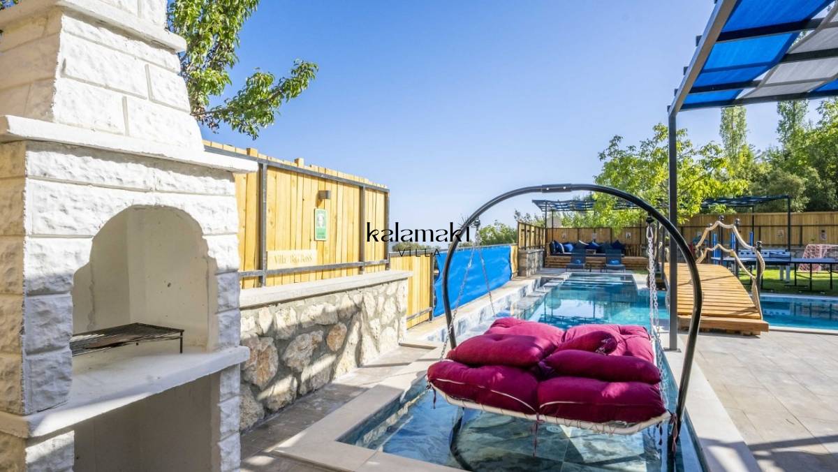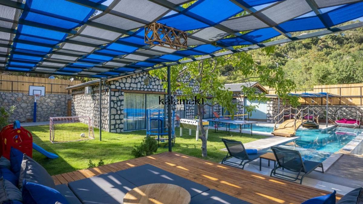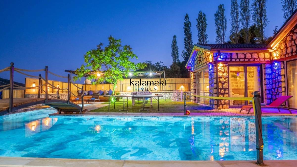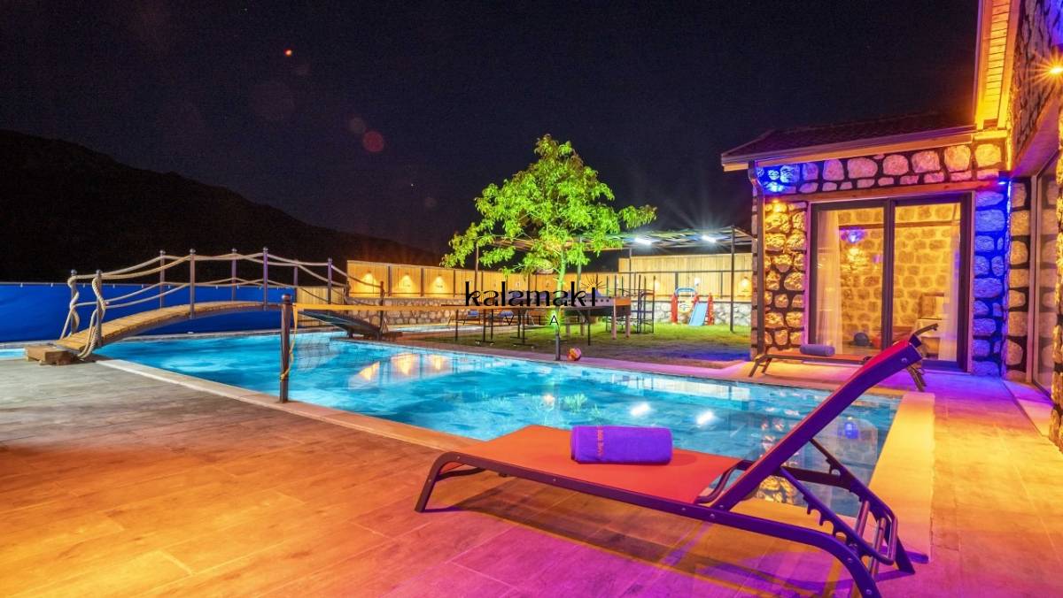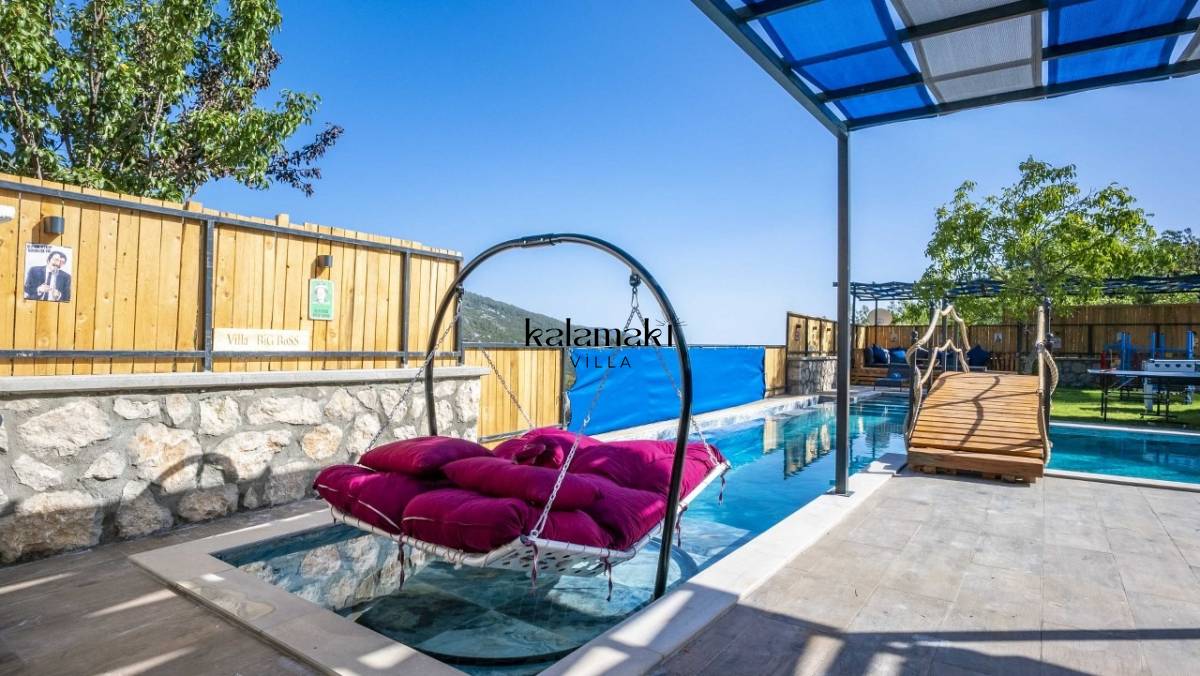 Kalkan İslamlar’ da bulunan taş mimarili ile özenle dekore edilmiş 2 yatak odalı, yeşillikler içinde özel muhafazakar havuzlu, masa tenisi, langırt, çocuklar için düşünülmüş oyun parkı, salıncak, mini futbol kalesi, küçük basket potası, oturma köşkü, tranbolin, masa tenisi, langırt, minyatür kale, havuzda voleybol filesi, tavla, satranç, domino, sauna ve oda içerisinde jakuzi bulunan villamız bölgenin en modern villalarından olup muhafazakar balayı çiftleri için uygun, lüks bir kiralık balayı villasıdır. Villa Big Boss geniş bir bahçe içerisinde yapılmış olup etrafında herhangi bir yerleşim olmadığı için tam korunaklı bir havuza sahiptir.