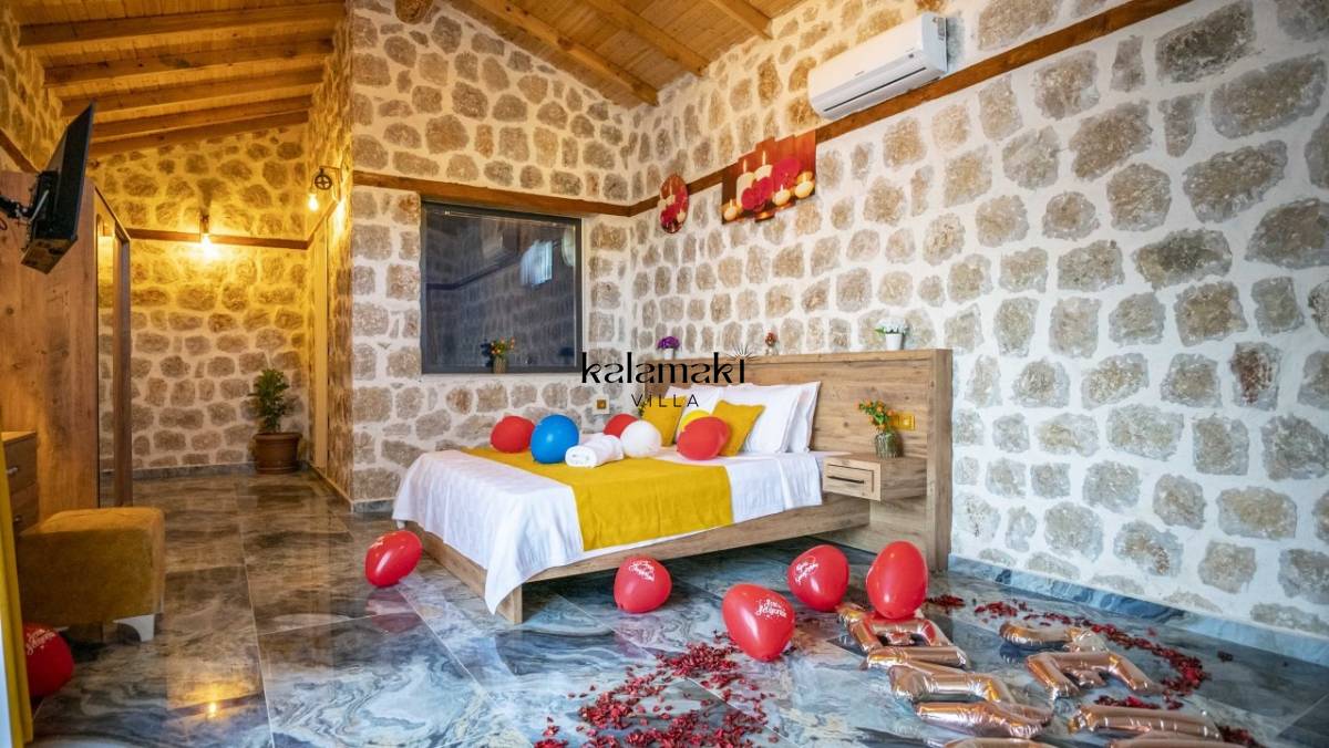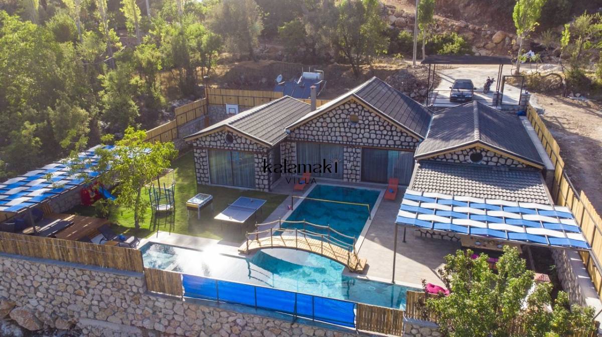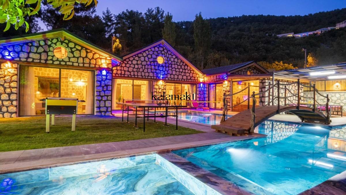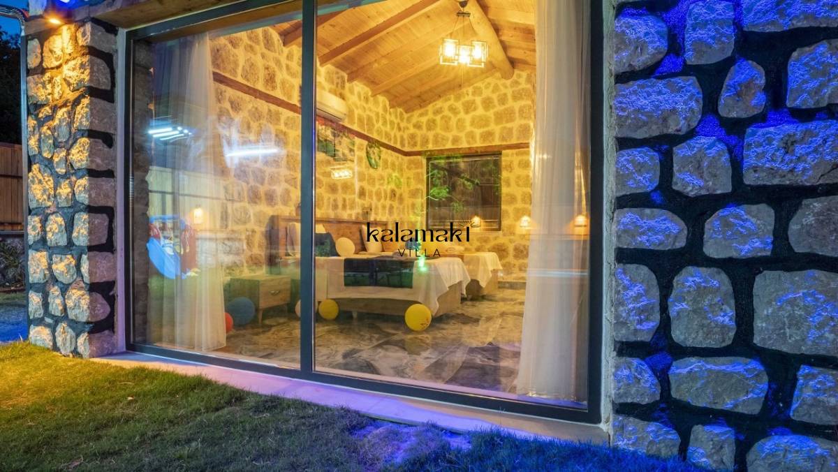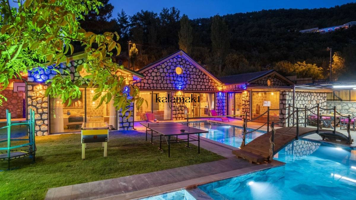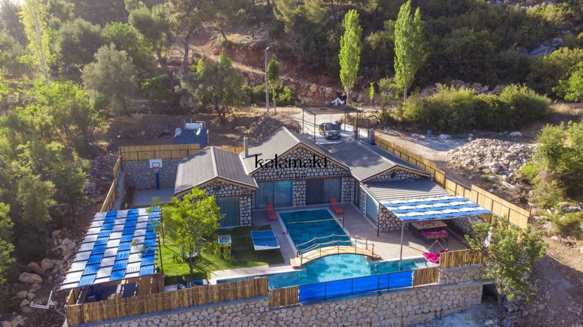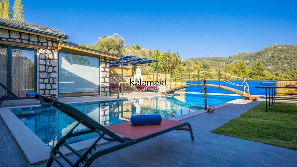 Kalkan İslamlar’ da bulunan taş mimarili ile özenle dekore edilmiş 2 yatak odalı, yeşillikler içinde özel muhafazakar havuzlu, masa tenisi, langırt, çocuklar için düşünülmüş oyun parkı, salıncak, mini futbol kalesi, küçük basket potası, oturma köşkü, tranbolin, masa tenisi, langırt, minyatür kale, havuzda voleybol filesi, tavla, satranç, domino, sauna ve oda içerisinde jakuzi bulunan villamız bölgenin en modern villalarından olup muhafazakar balayı çiftleri için uygun, lüks bir kiralık balayı villasıdır. Villa Big Boss geniş bir bahçe içerisinde yapılmış olup etrafında herhangi bir yerleşim olmadığı için tam korunaklı bir havuza sahiptir.
