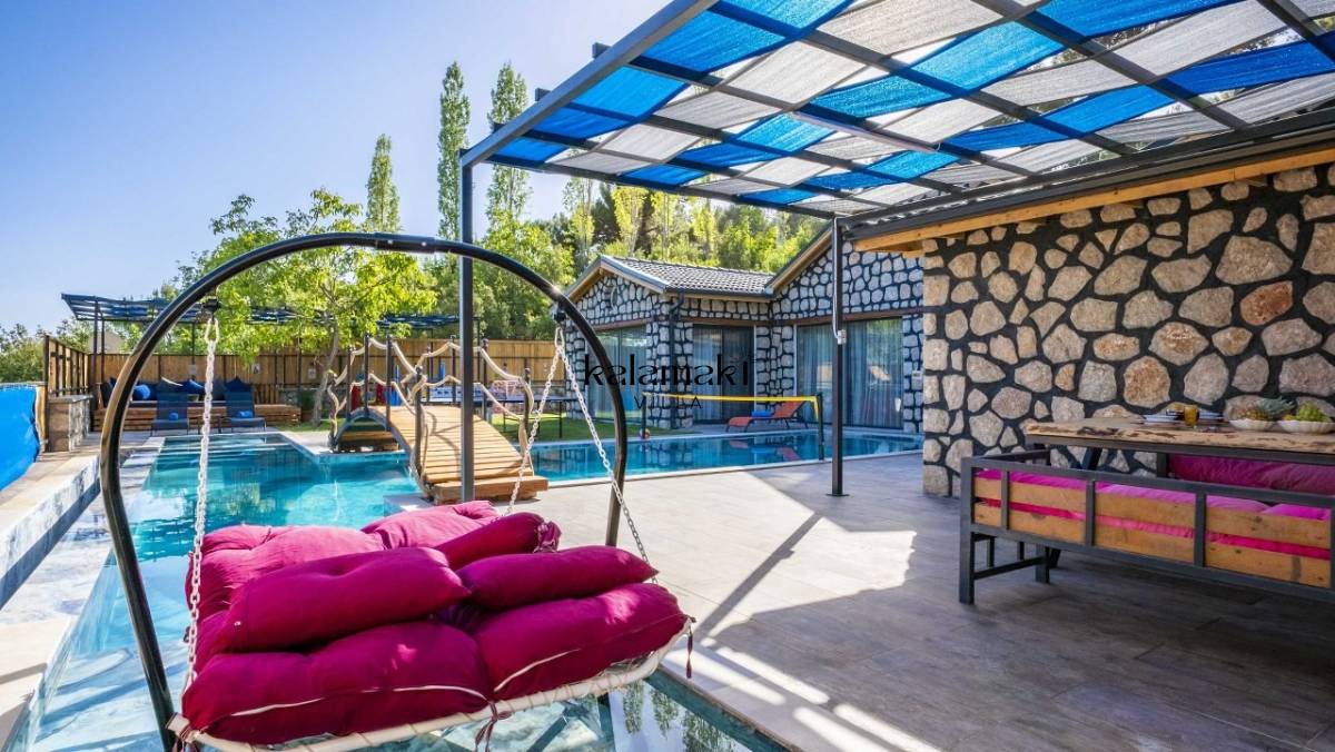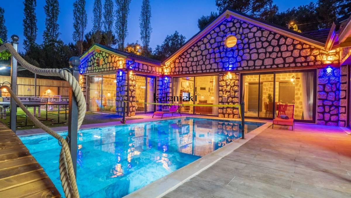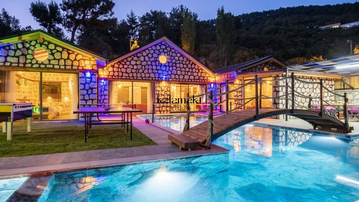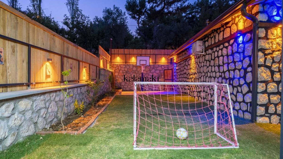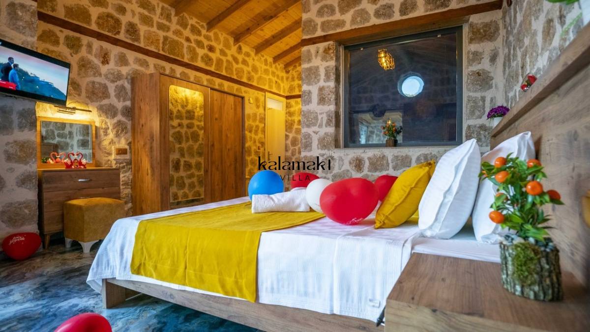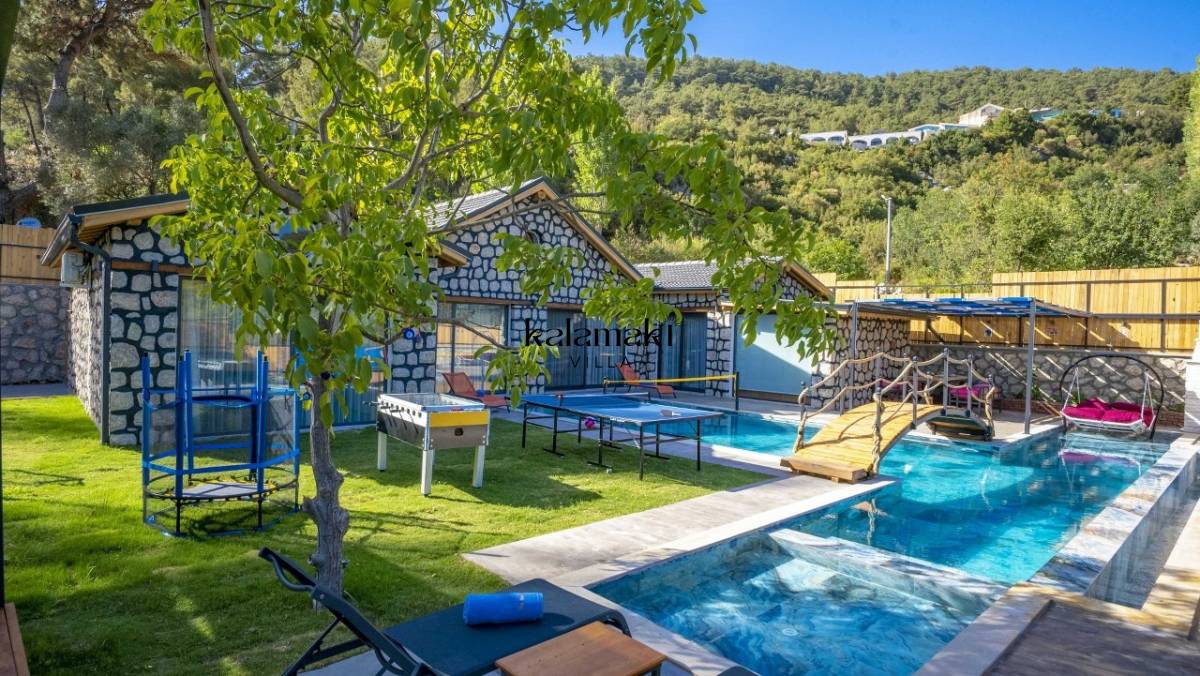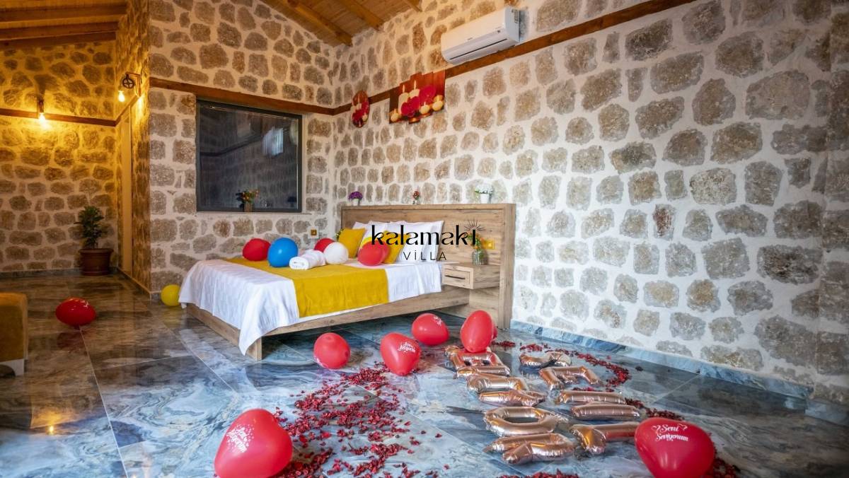 Kalkan İslamlar’ da bulunan taş mimarili ile özenle dekore edilmiş 2 yatak odalı, yeşillikler içinde özel muhafazakar havuzlu, masa tenisi, langırt, çocuklar için düşünülmüş oyun parkı, salıncak, mini futbol kalesi, küçük basket potası, oturma köşkü, tranbolin, masa tenisi, langırt, minyatür kale, havuzda voleybol filesi, tavla, satranç, domino, sauna ve oda içerisinde jakuzi bulunan villamız bölgenin en modern villalarından olup muhafazakar balayı çiftleri için uygun, lüks bir kiralık balayı villasıdır. Villa Big Boss geniş bir bahçe içerisinde yapılmış olup etrafında herhangi bir yerleşim olmadığı için tam korunaklı bir havuza sahiptir.