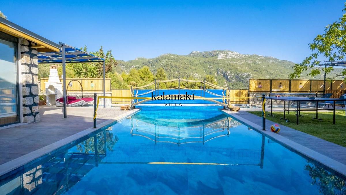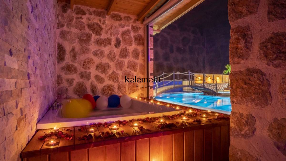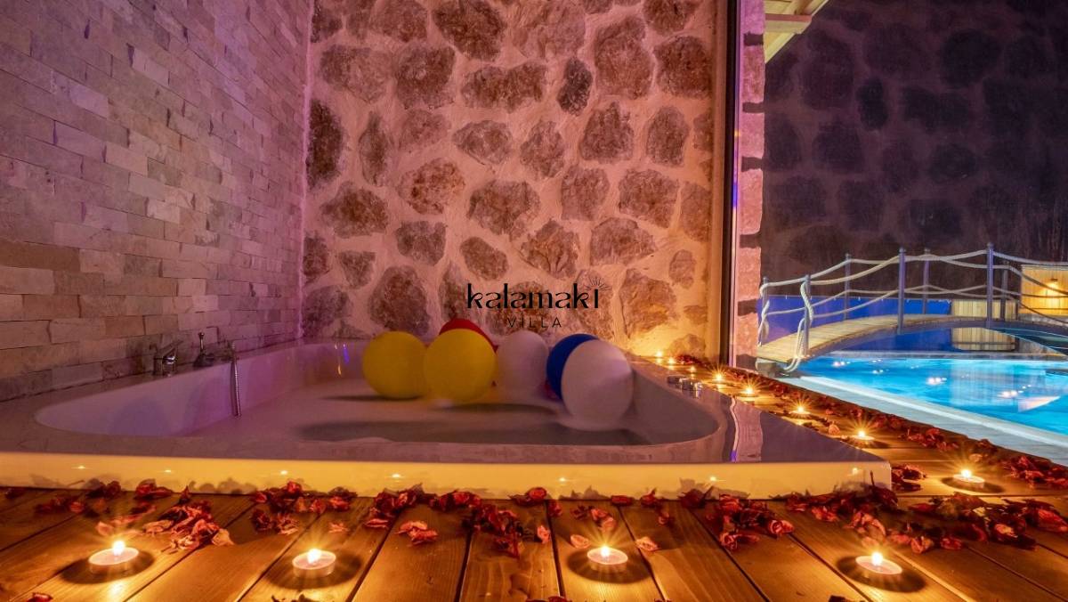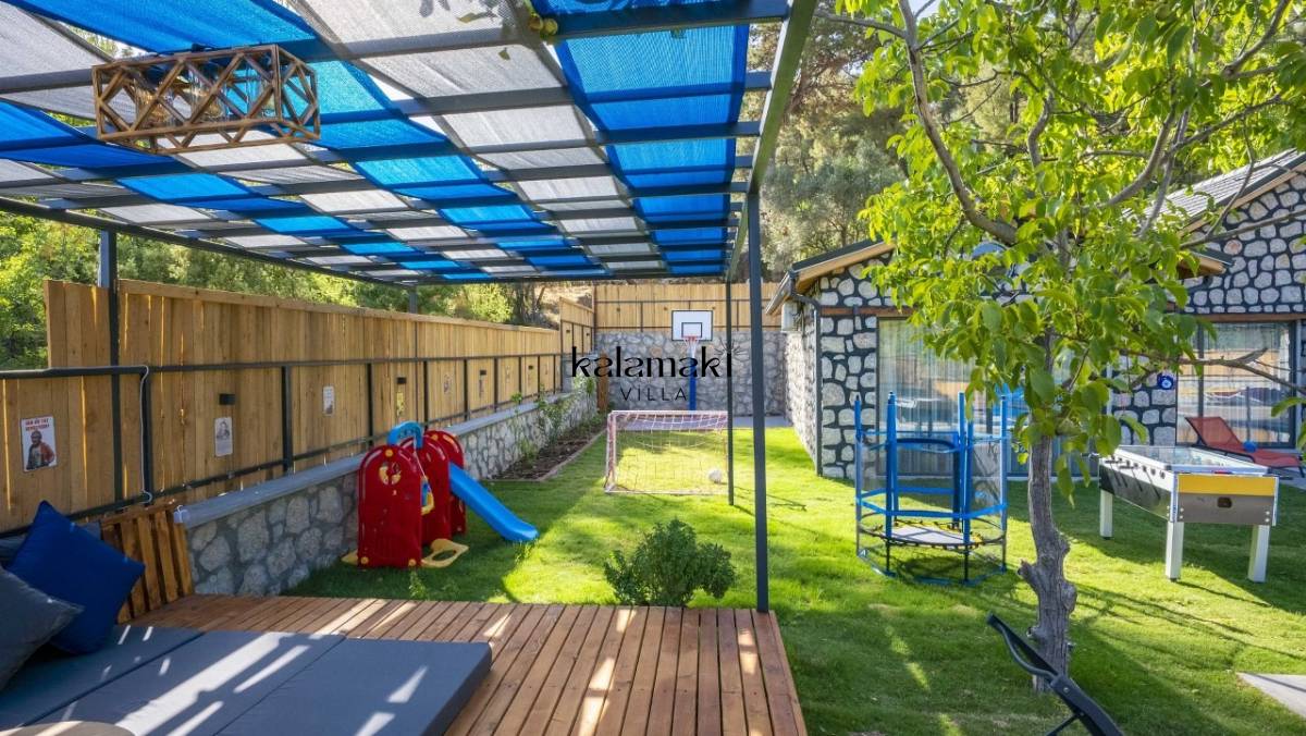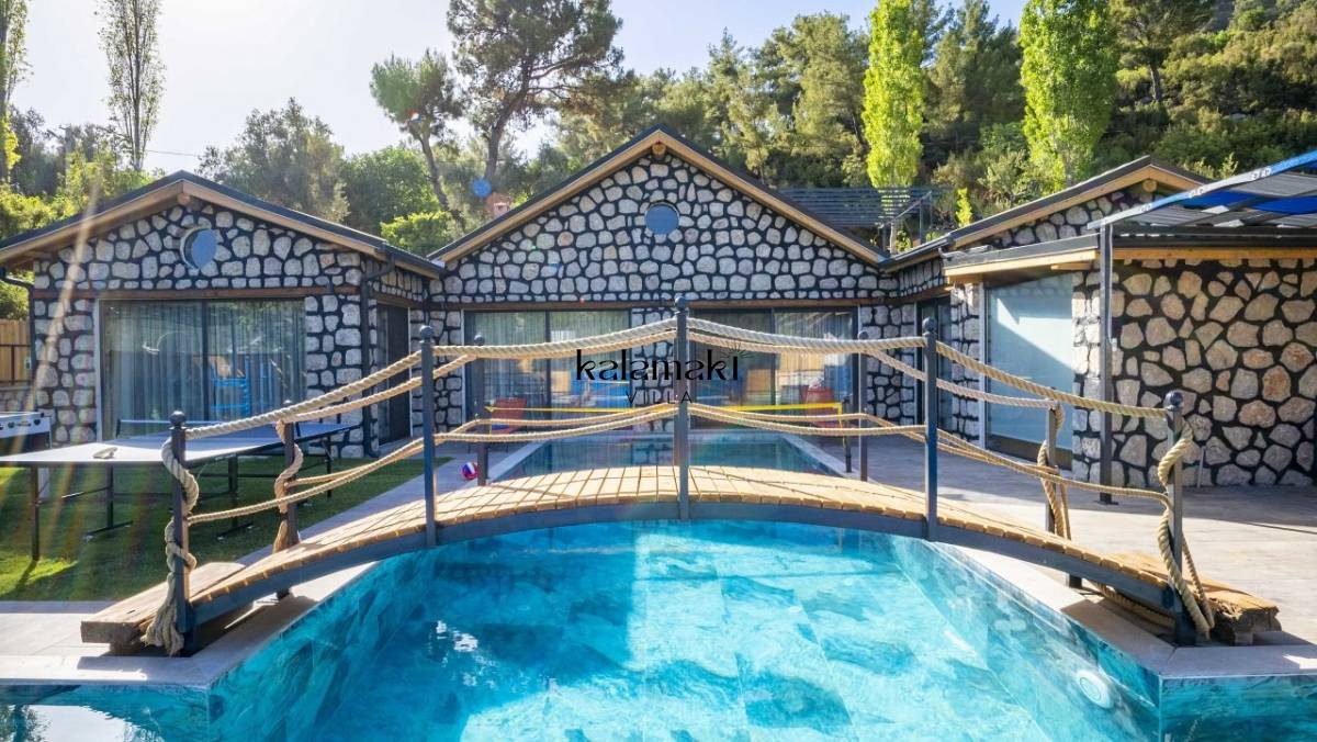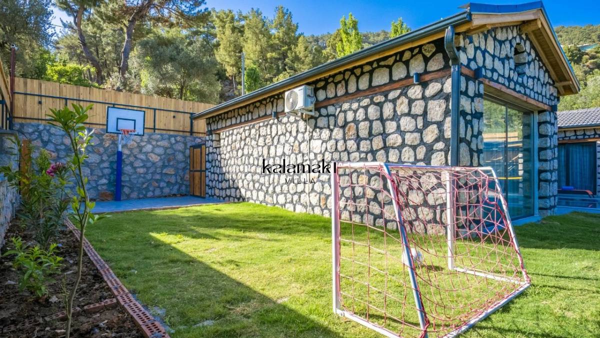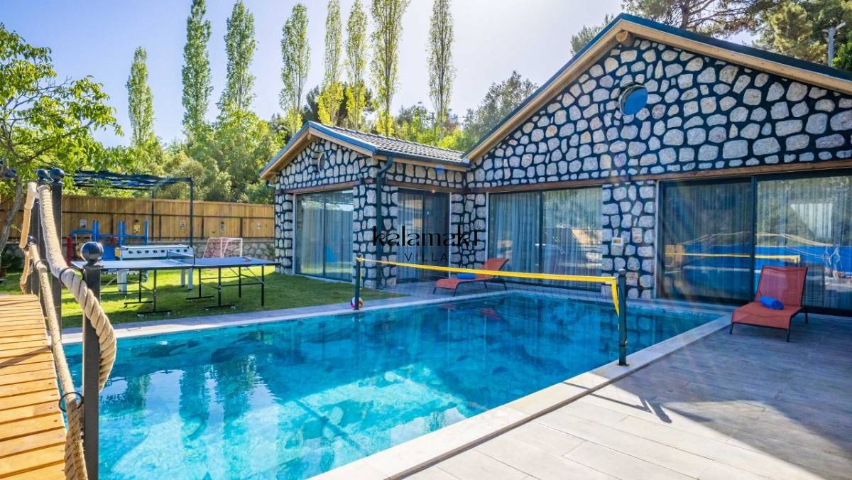 Kalkan İslamlar’ da bulunan taş mimarili ile özenle dekore edilmiş 2 yatak odalı, yeşillikler içinde özel muhafazakar havuzlu, masa tenisi, langırt, çocuklar için düşünülmüş oyun parkı, salıncak, mini futbol kalesi, küçük basket potası, oturma köşkü, tranbolin, masa tenisi, langırt, minyatür kale, havuzda voleybol filesi, tavla, satranç, domino, sauna ve oda içerisinde jakuzi bulunan villamız bölgenin en modern villalarından olup muhafazakar balayı çiftleri için uygun, lüks bir kiralık balayı villasıdır. Villa Big Boss geniş bir bahçe içerisinde yapılmış olup etrafında herhangi bir yerleşim olmadığı için tam korunaklı bir havuza sahiptir.