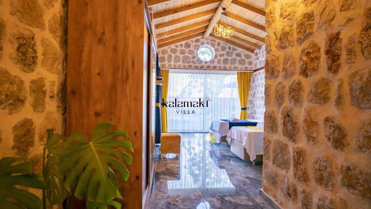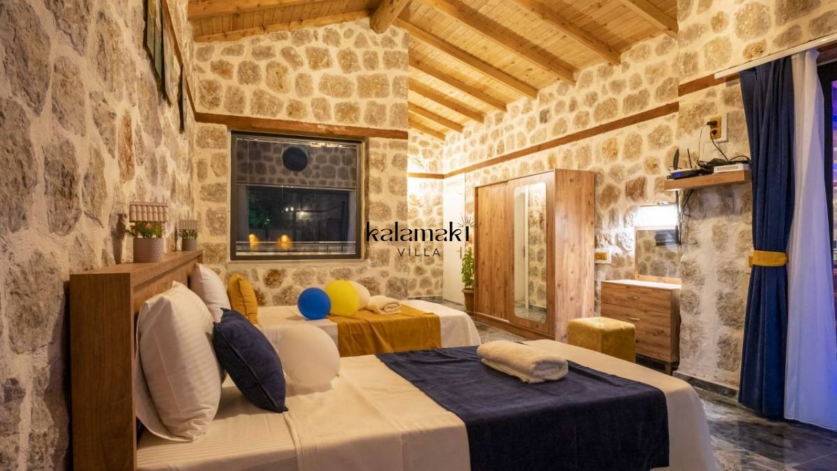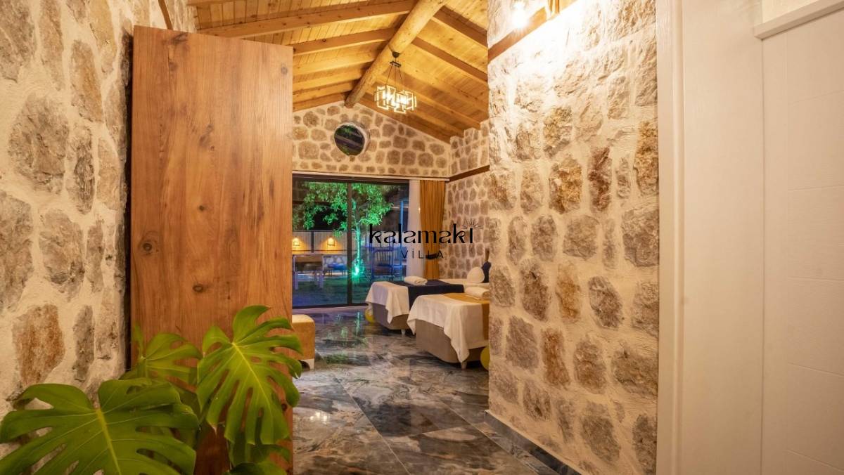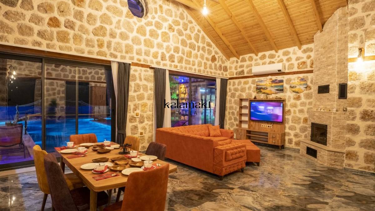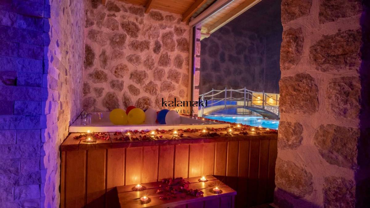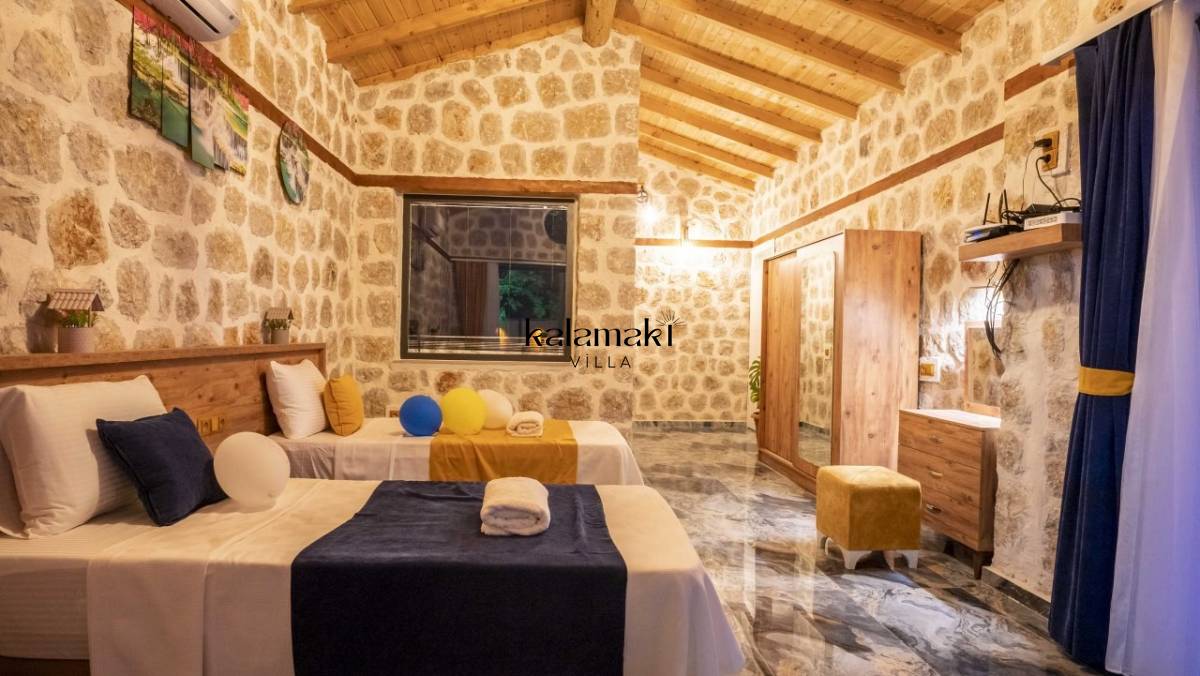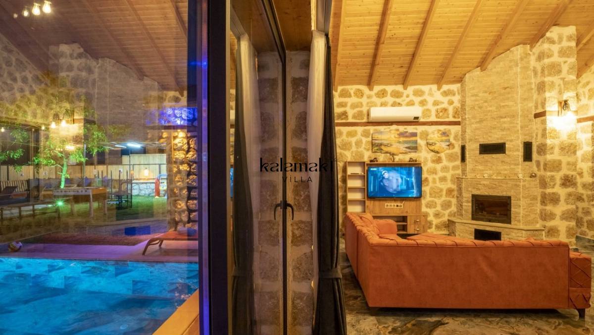Kalkan İslamlar’ da bulunan taş mimarili ile özenle dekore edilmiş 2 yatak odalı, yeşillikler içinde özel muhafazakar havuzlu, masa tenisi, langırt, çocuklar için düşünülmüş oyun parkı, salıncak, mini futbol kalesi, küçük basket potası, oturma köşkü, tranbolin, masa tenisi, langırt, minyatür kale, havuzda voleybol filesi, tavla, satranç, domino, sauna ve oda içerisinde jakuzi bulunan villamız bölgenin en modern villalarından olup muhafazakar balayı çiftleri için uygun, lüks bir kiralık balayı villasıdır. Villa Big Boss geniş bir bahçe içerisinde yapılmış olup etrafında herhangi bir yerleşim olmadığı için tam korunaklı bir havuza sahiptir.