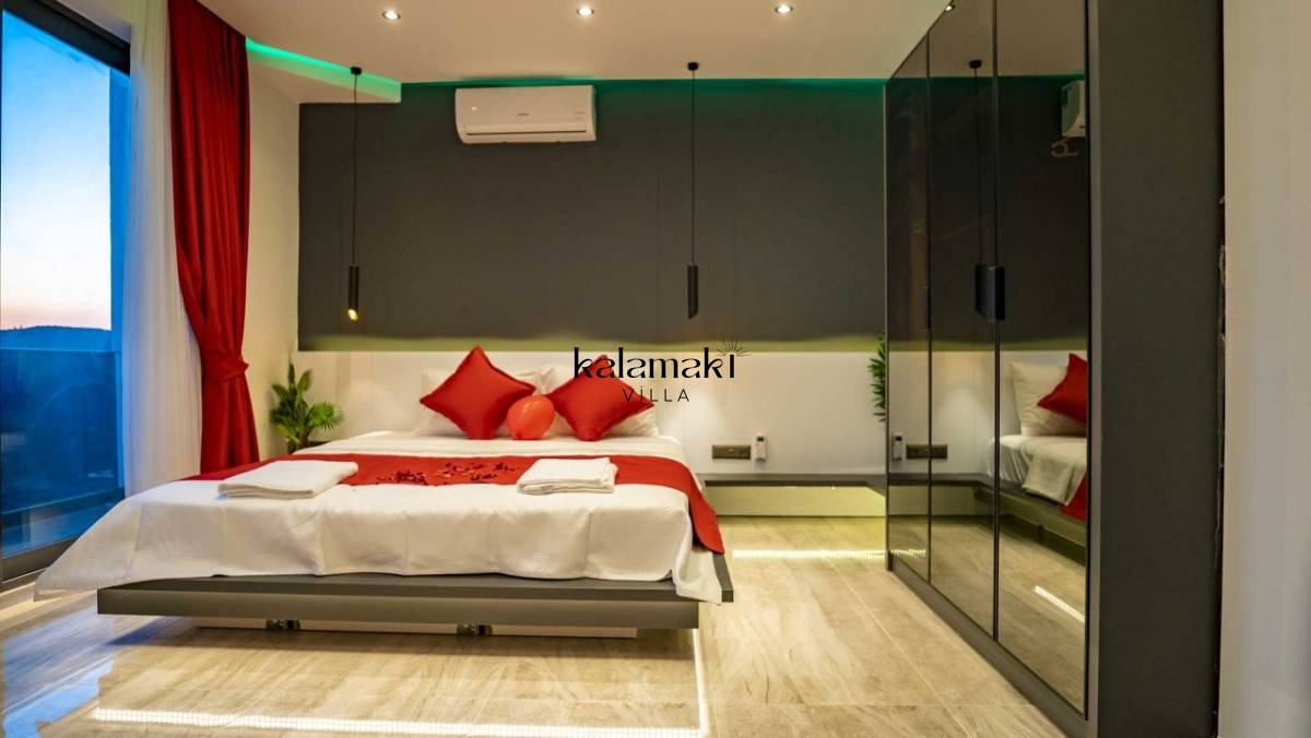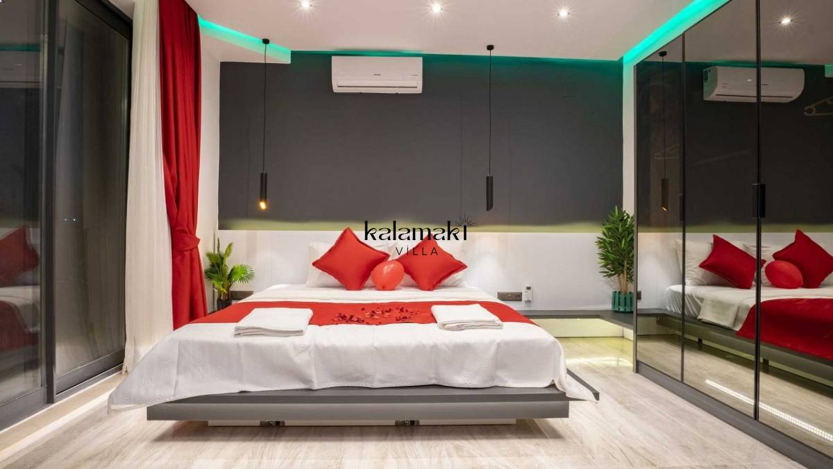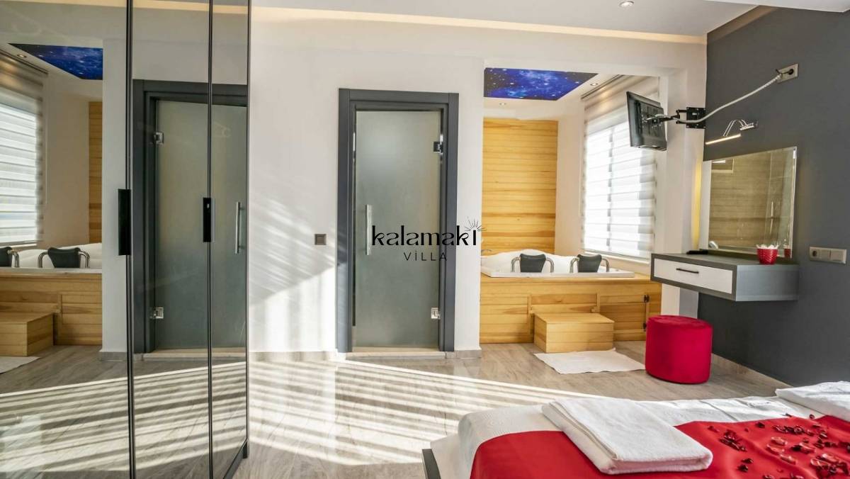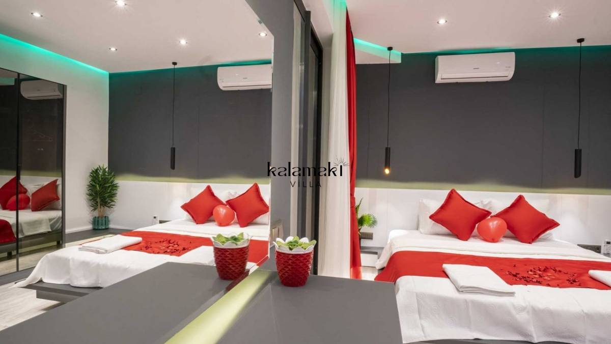 Villamızda üç yatak odası ve dört banyo bulunmaktadır. Birinci yatak odasında çift kişilik yatak, banyo, jakuzi ve klima bulunmaktadır. Diğer iki yatak odasında ise çift kişilik yatak, klima ve banyo bulunmaktadır. Salon içerisinde mutfak, klima, oturma grubu, banyo ve televizyon mevcuttur.