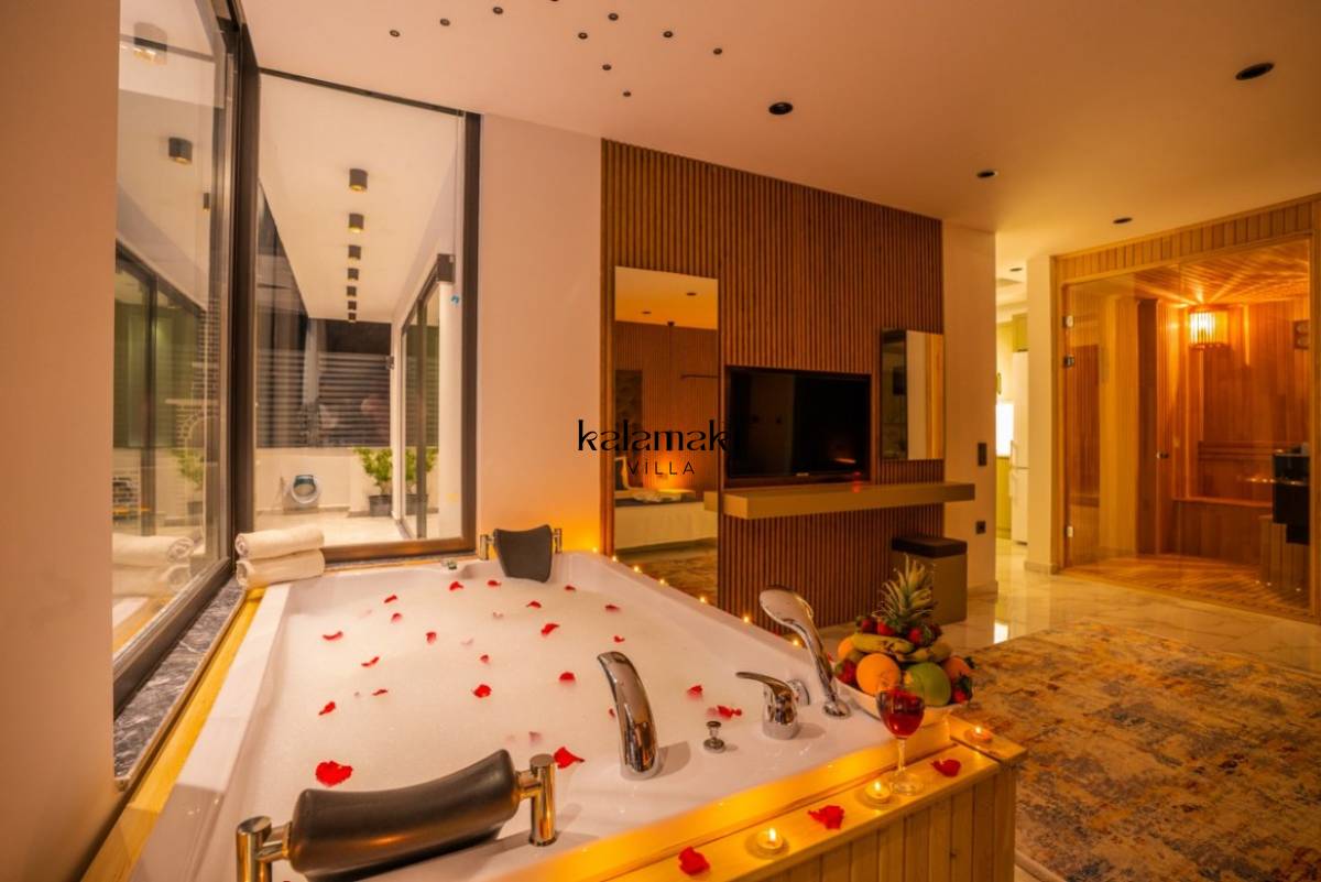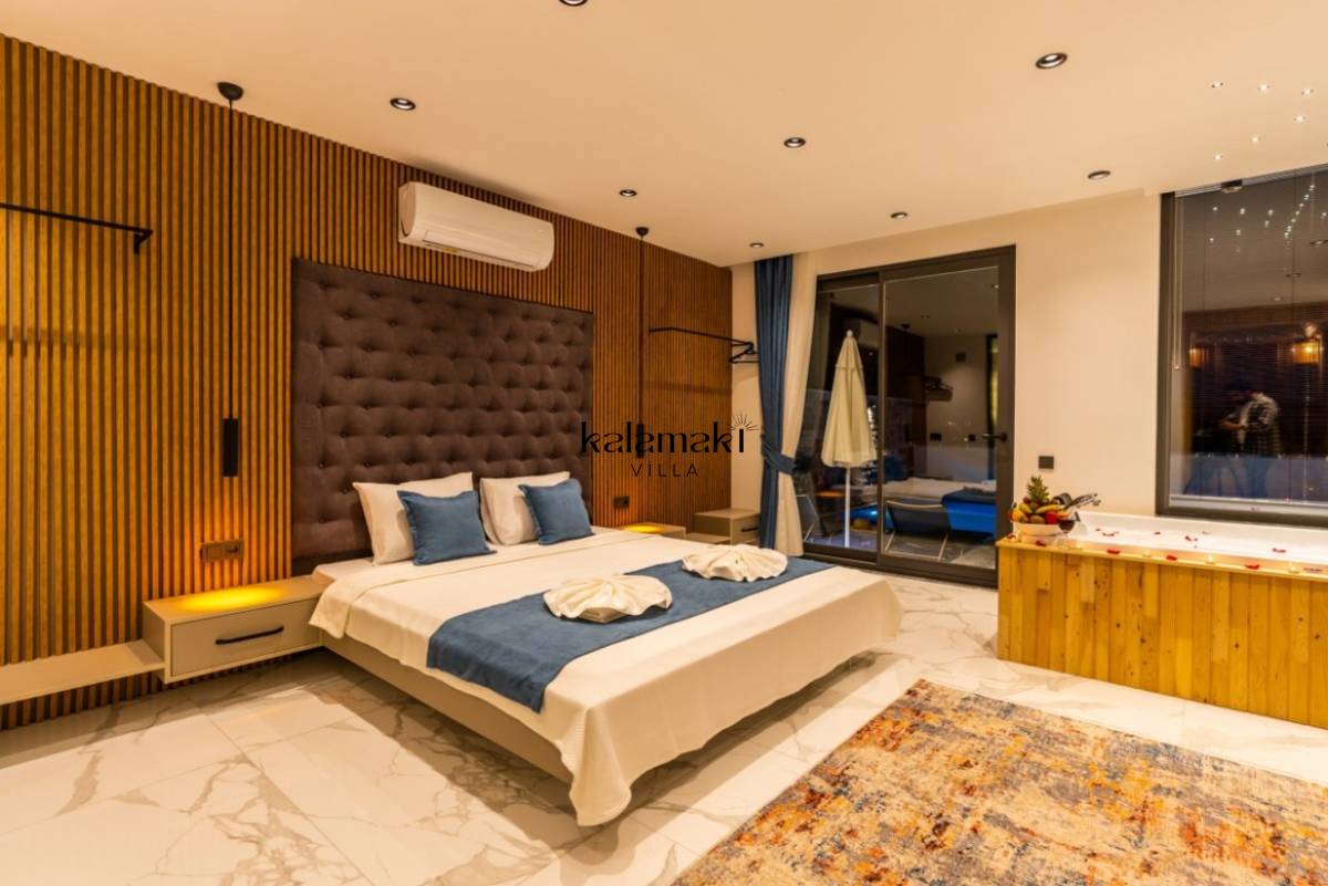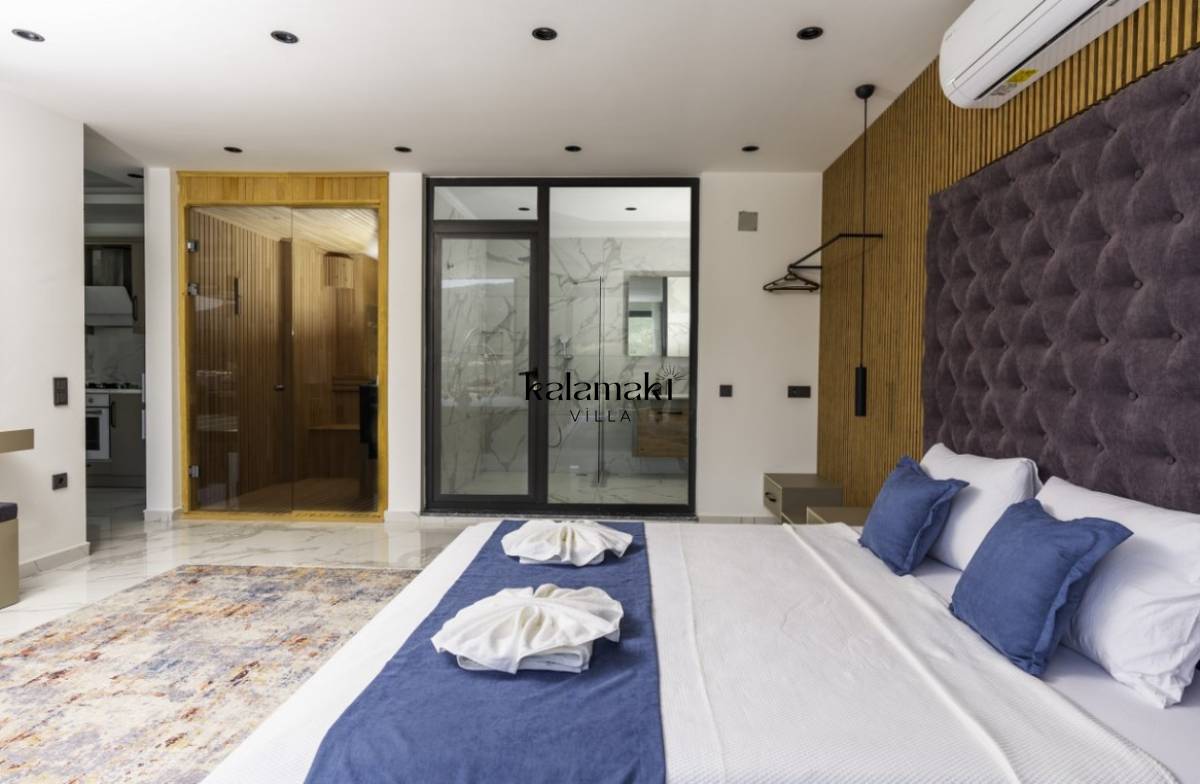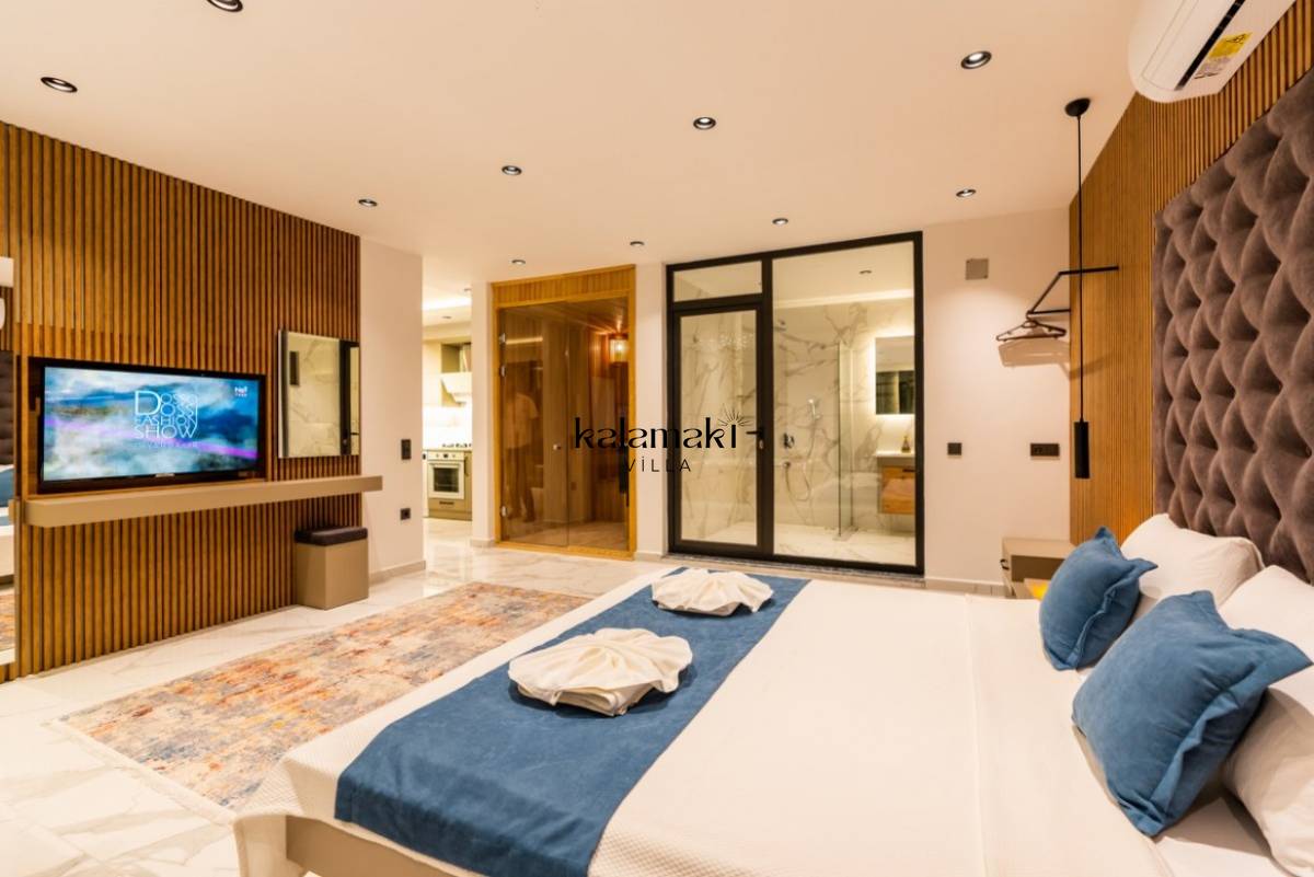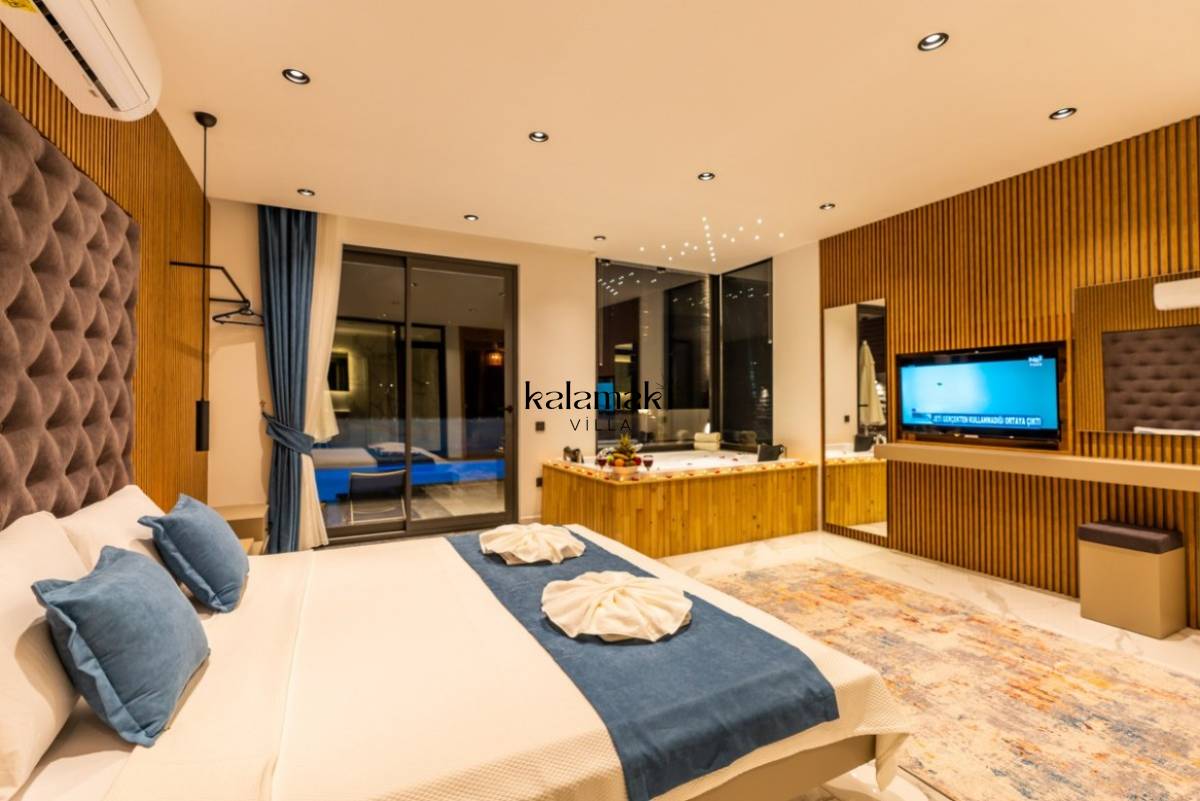 1. Yatak Odası; 1 adet çift kişilik yatak, jakuzi, TV, Sauna, elbise dolabı, makyaj masası, komodin, klima ve banyo-wc bulunmaktadır.