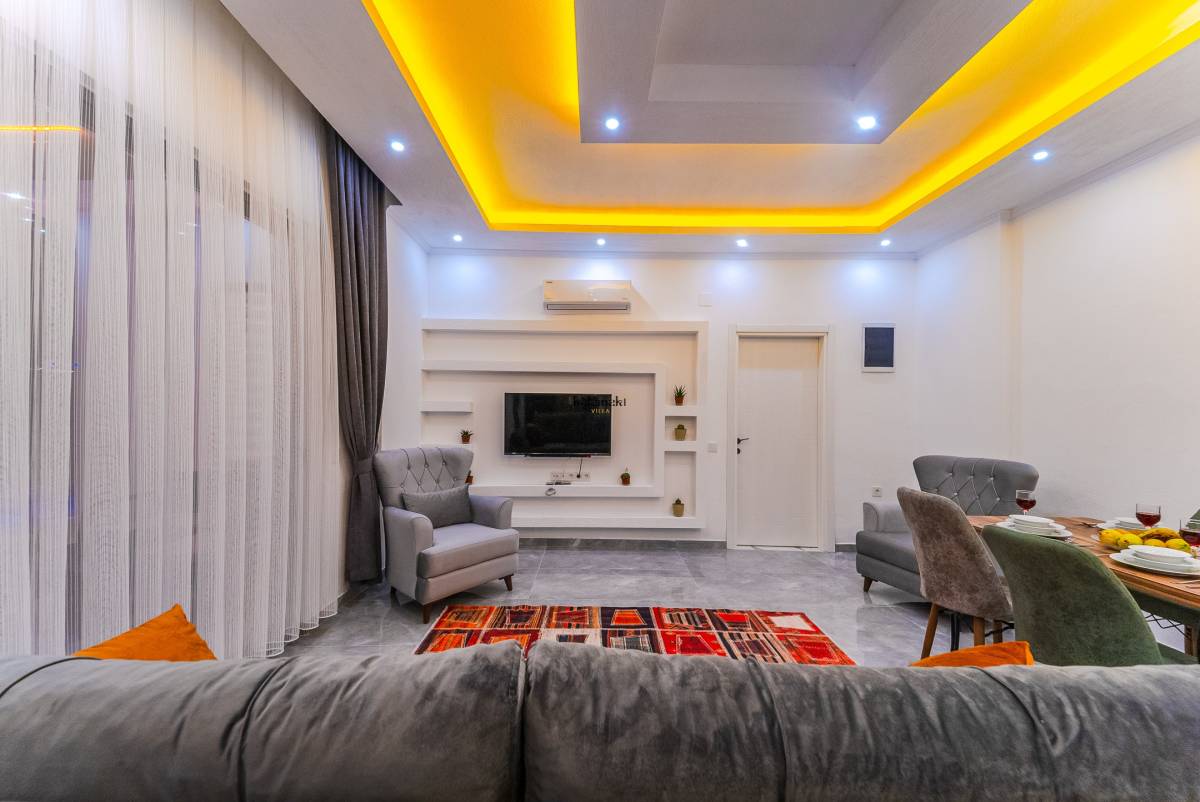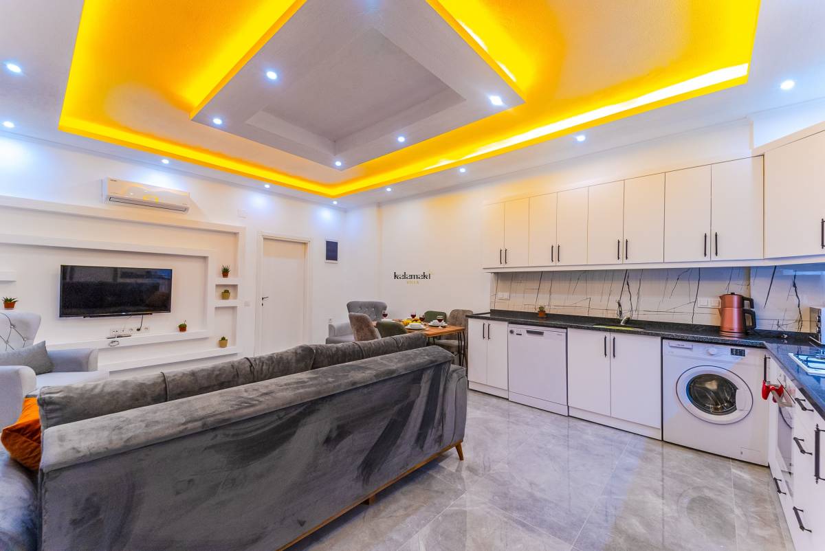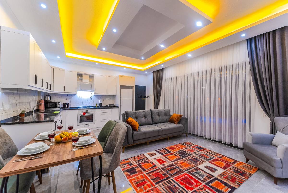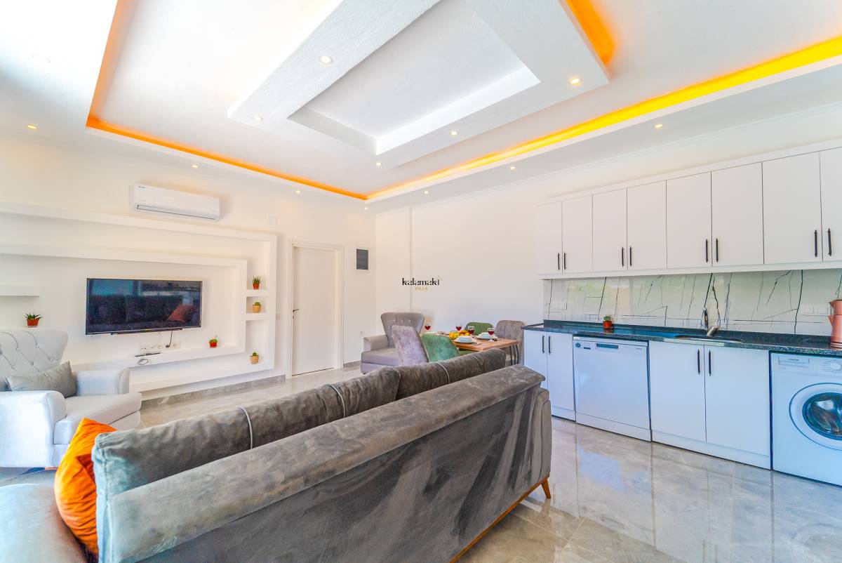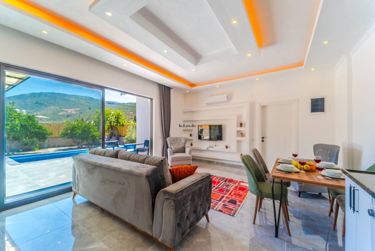 Salonda ise mutfak, televizyon, klima ve rahat bir oturma grubu bulunmaktadır. Bu sayede misafirler, konforlu bir şekilde vakit geçirebilirler. Villa Turan, sakin ve özel bir konaklama deneyimi sunarak misafirlerine unutulmaz bir tatil fırsatı sunmaktadır