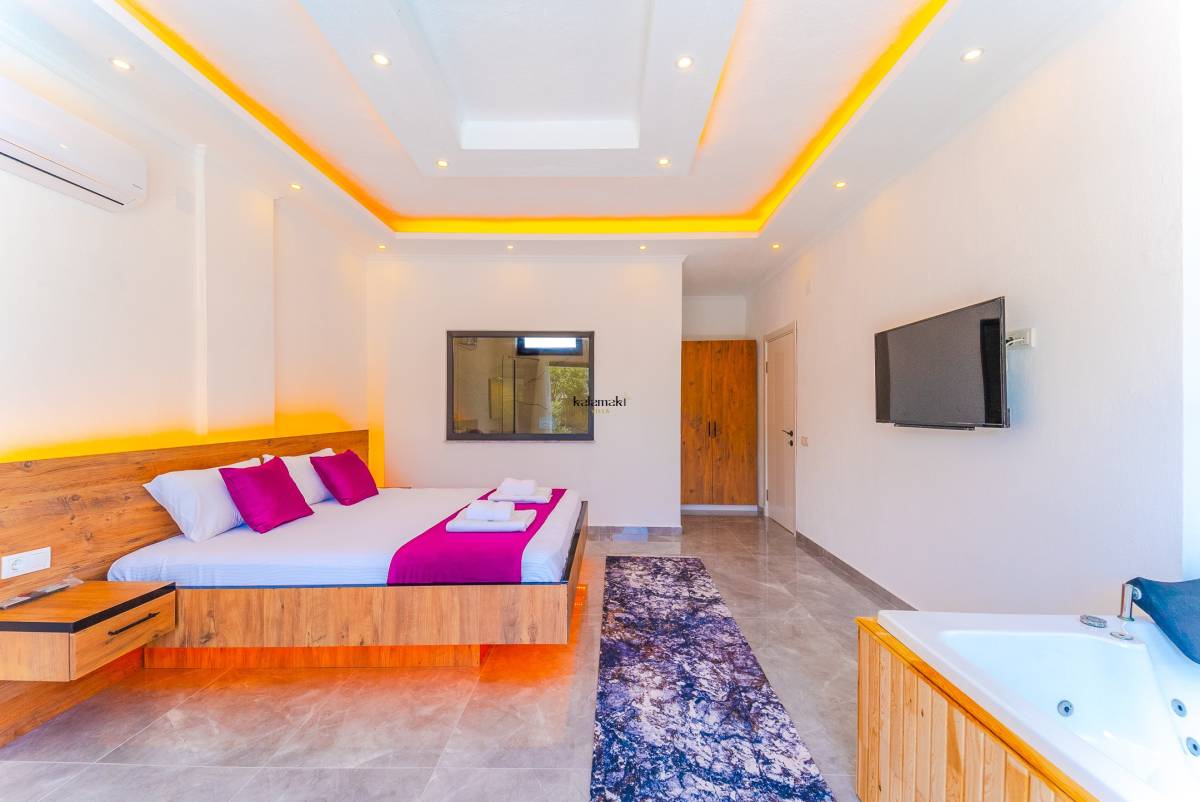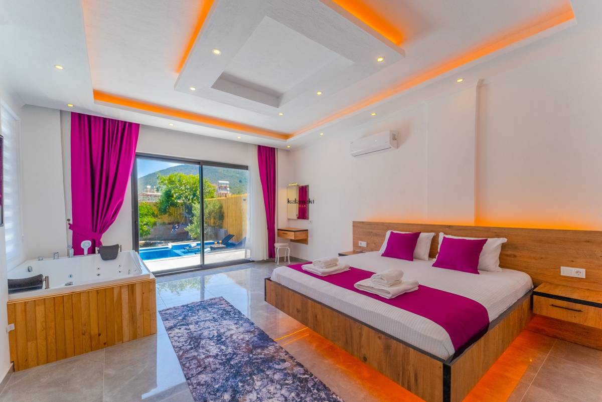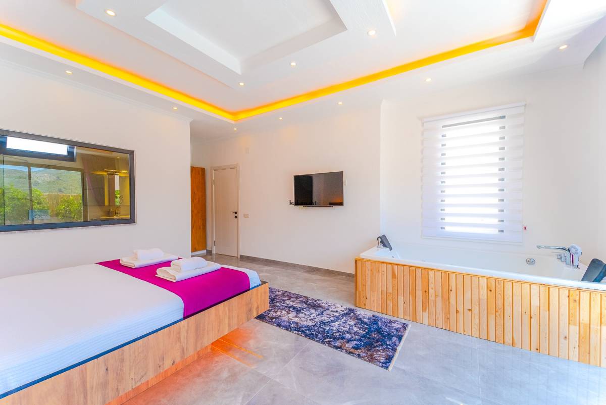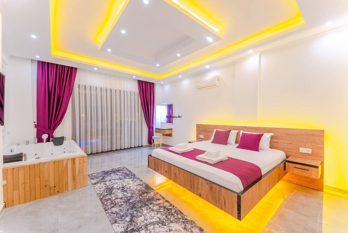 Kiralık Villada bir yatak odası ve bir banyo bulunmaktadır. Yatak odasında çift kişilik yatak, klima ve özel bir jakuzi yer almaktadır. Banyo ise modern olanaklarla donatılmıştır.