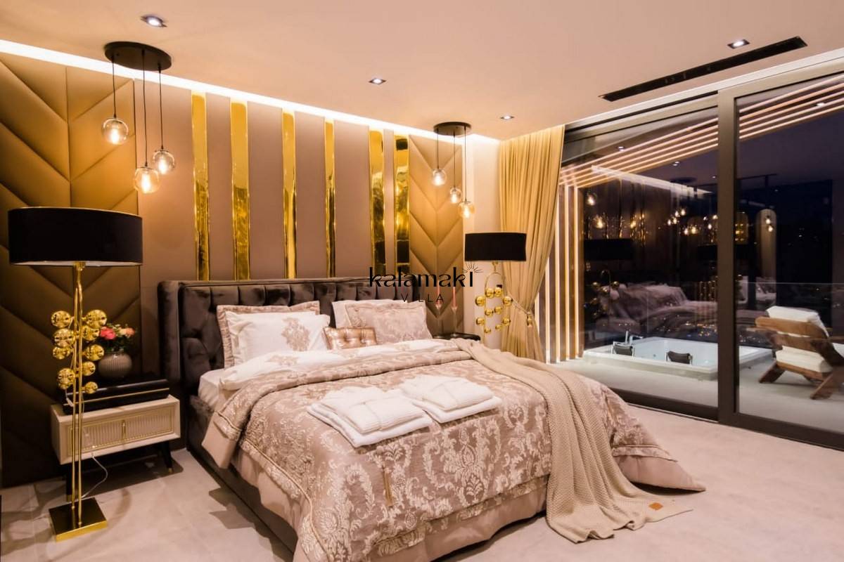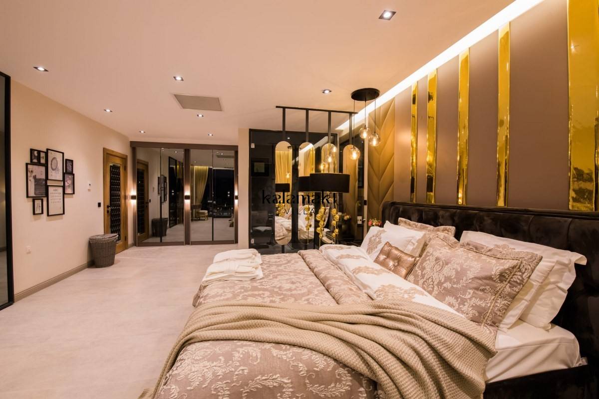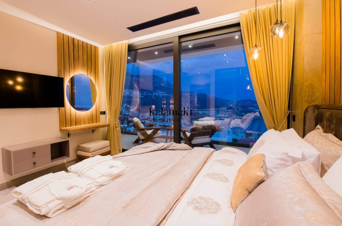Yatak Odası 4: Füme cam bölmeli ve Rain Forest duşlu ana çift kişilik en-suite duş odası, kral yatak, boy aynalı gardırop, makyaj masası, akıllı TV, saç kurutma makinesi, klima, muhteşem deniz manzarası.