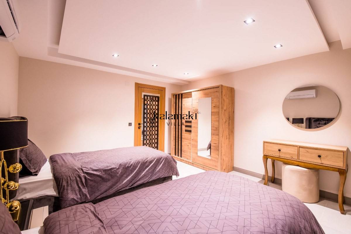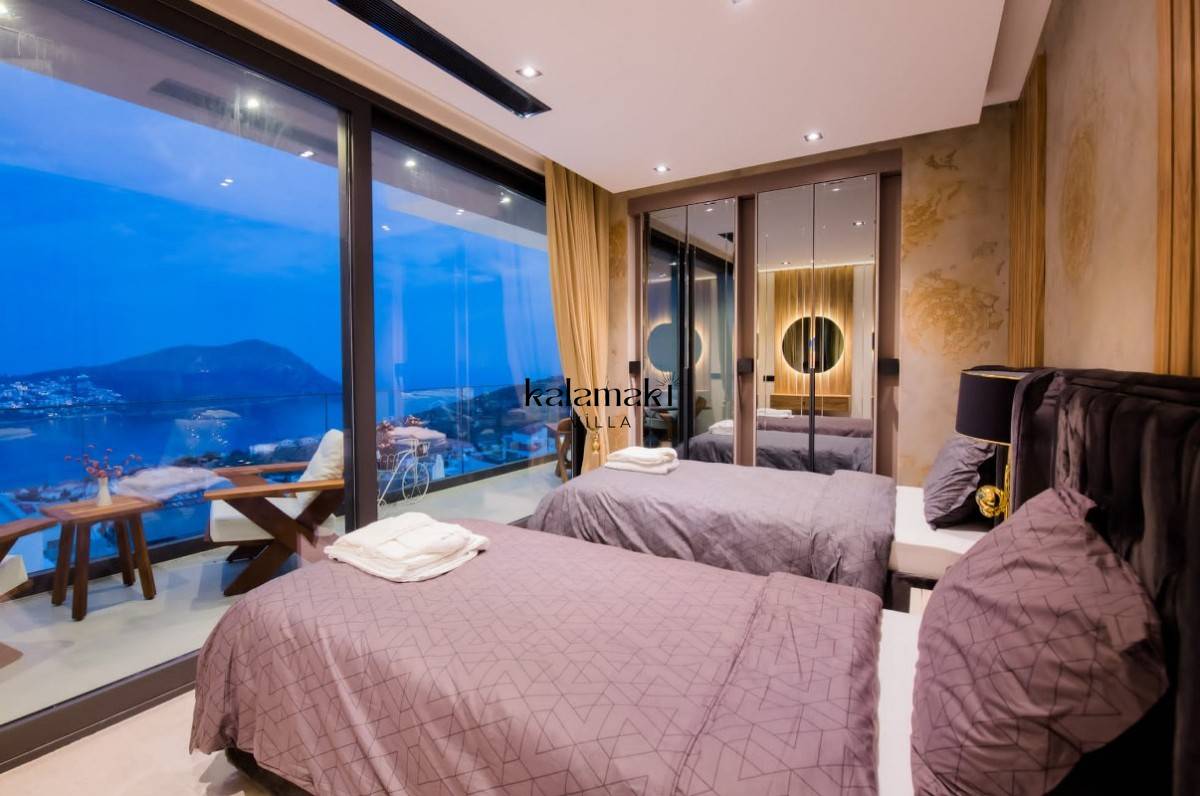 Yatak Odası 2: Füme cam bölmeli ve Rain Forest duşlu ikiz en-suite duş odası, tek kişilik yataklar, boy aynalı gardırop, makyaj masası, akıllı TV, saç kurutma makinesi, klima, muhteşem deniz manzarası.