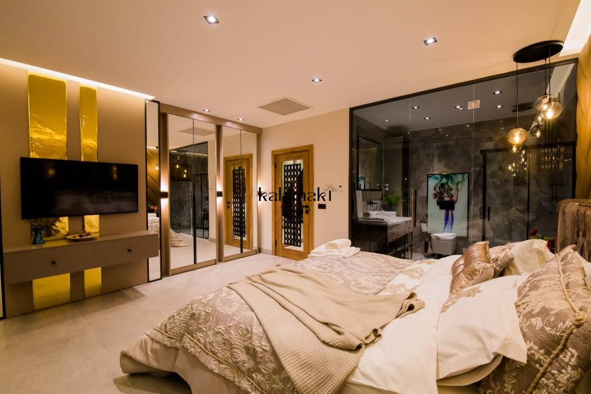 Yatak Odası 4: Füme cam bölmeli ve Rain Forest duşlu ana çift kişilik en-suite duş odası, kral yatak, boy aynalı gardırop, makyaj masası, akıllı TV, saç kurutma makinesi, klima, muhteşem deniz manzarası.