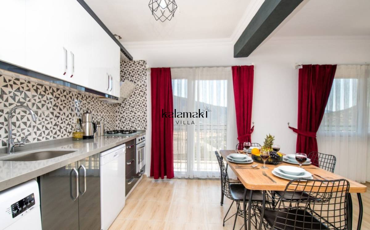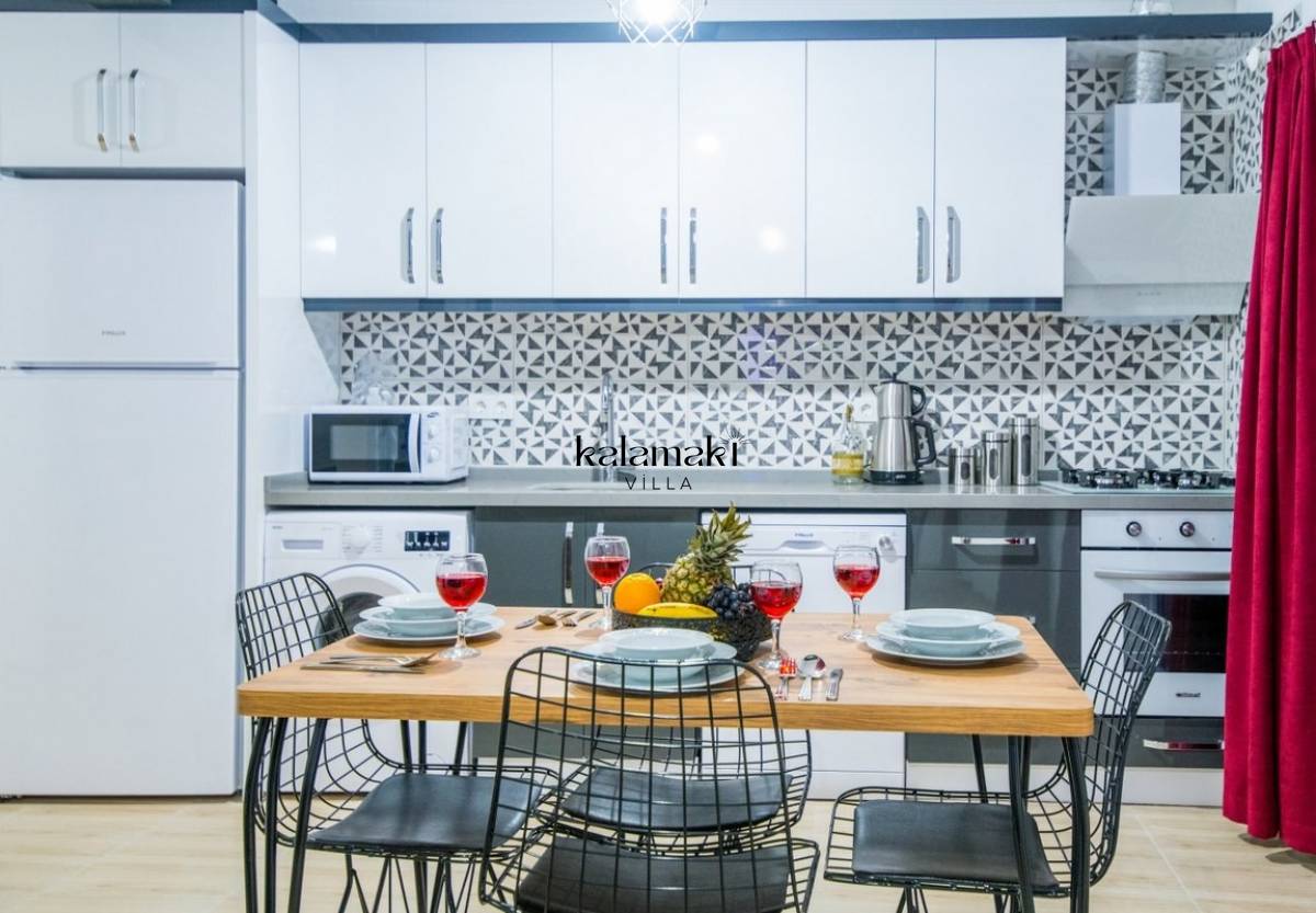 Muftak : Siyah ve beyaz şıklığının hakim olduğu Amerkan mutfak içerisinde buzdolabı, bulaşık makinesi, ocak, fırın, su ısıtıcısı, yemek masası, yemek takımı ve yemek pişirme araç gereçleri yer almaktadır.