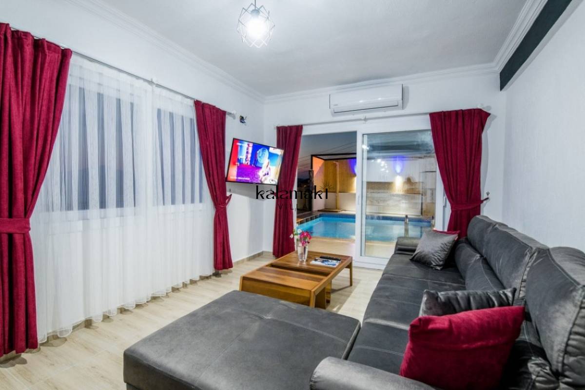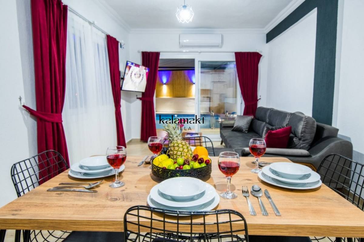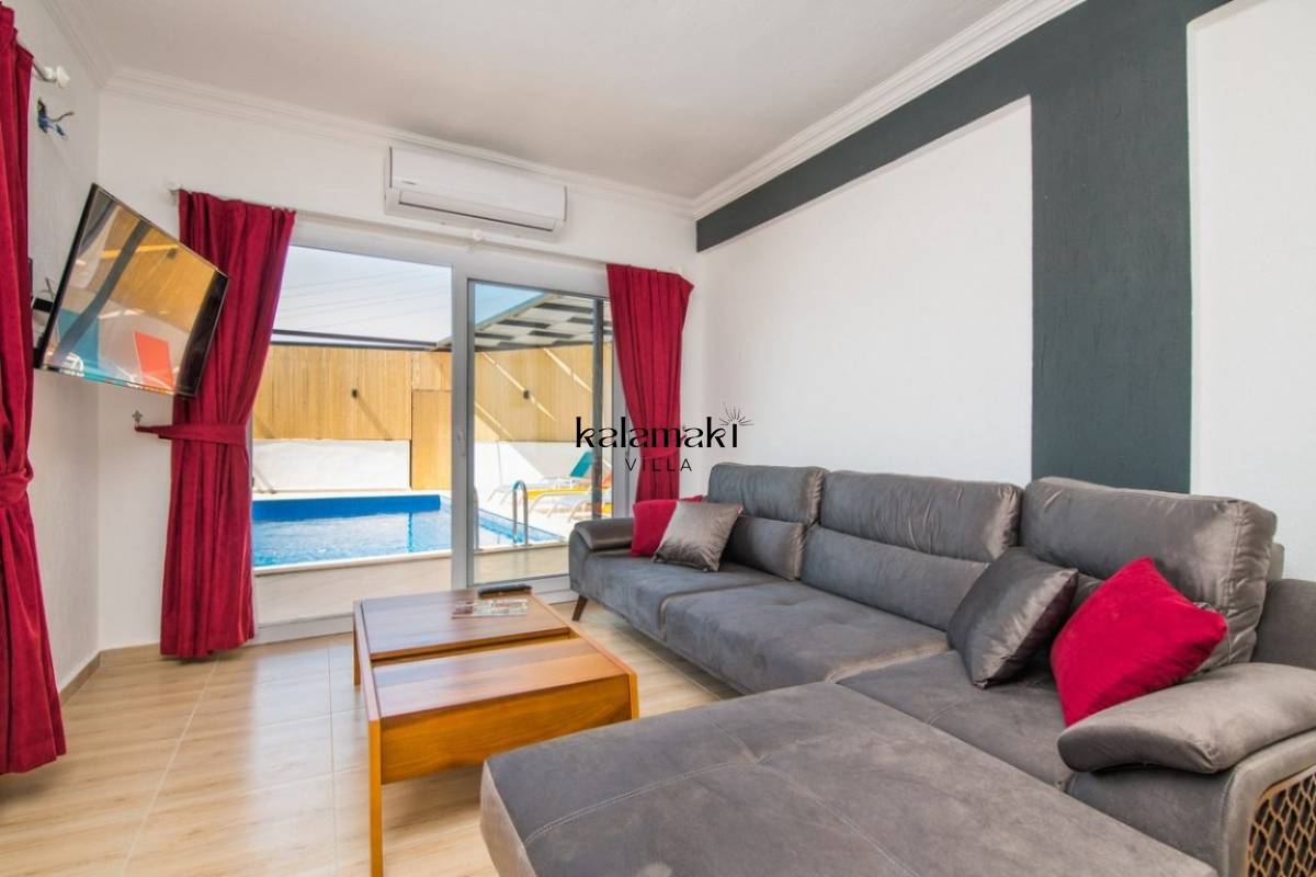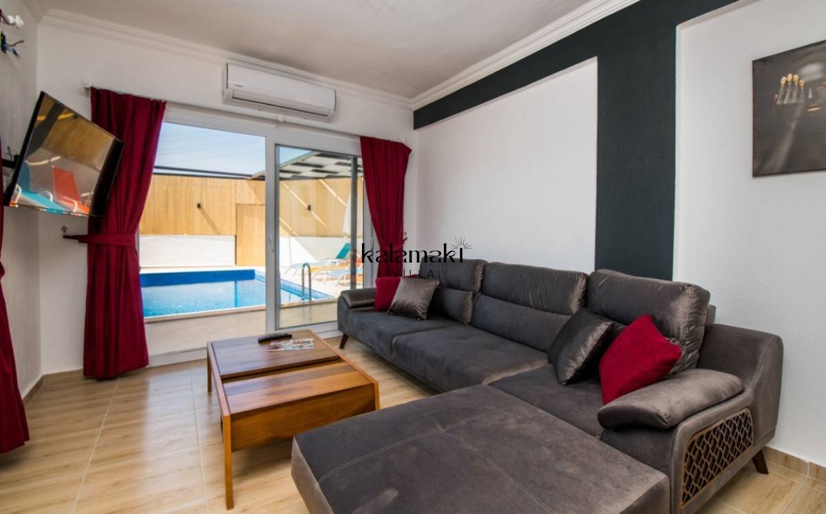 Salon :Modern ve konforlu eşyalar ile dekore edilen villamızın salonunda rahat oturma grubu, TV DVD oynatıcı, uydu alıcısı, klima ve internet yer almaktadır. Salondan havuz terasına çıkış vardır.