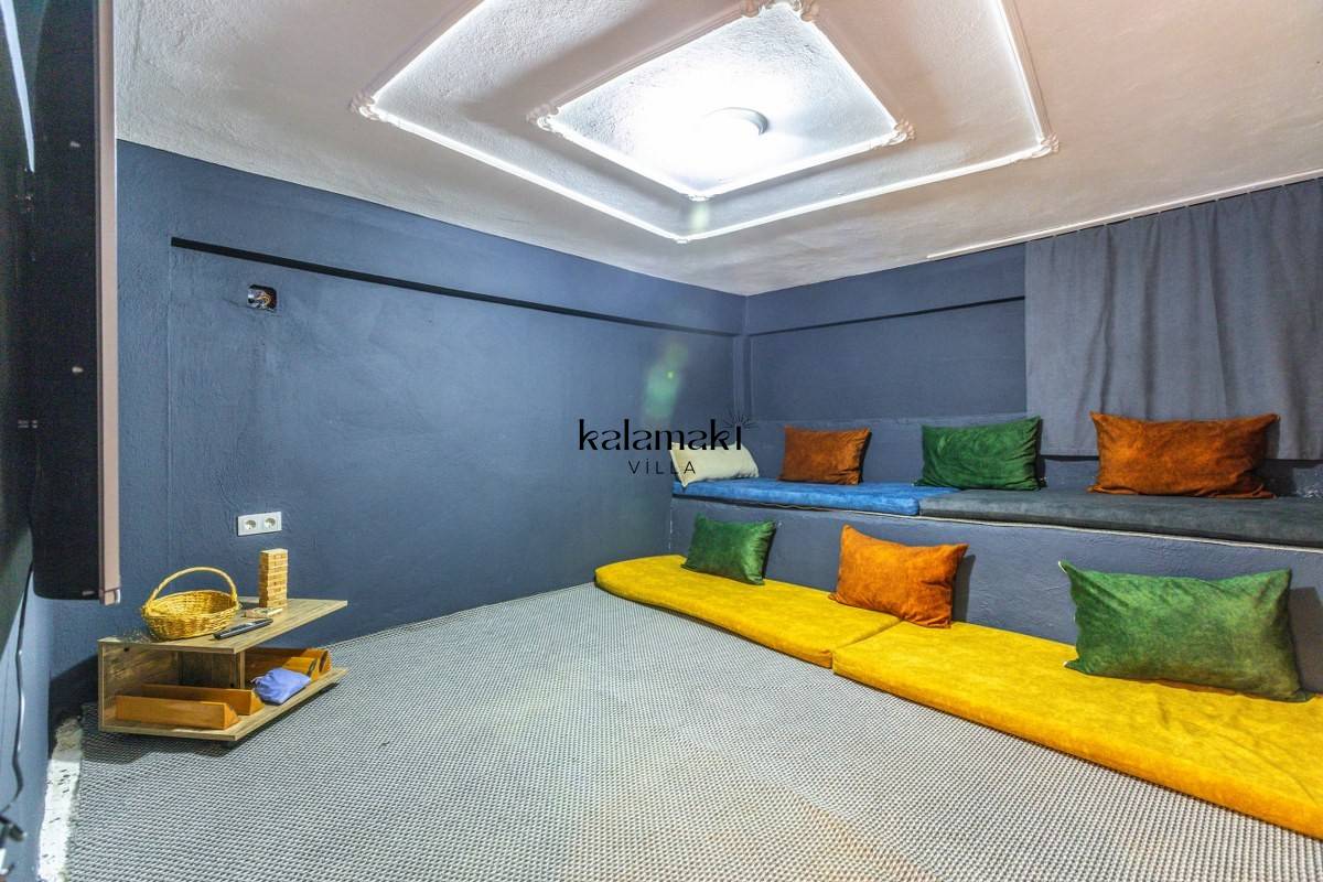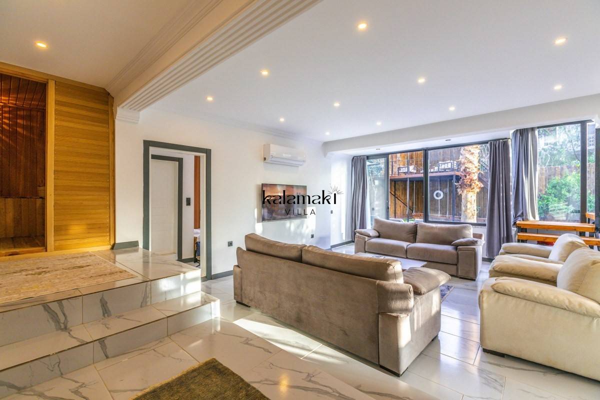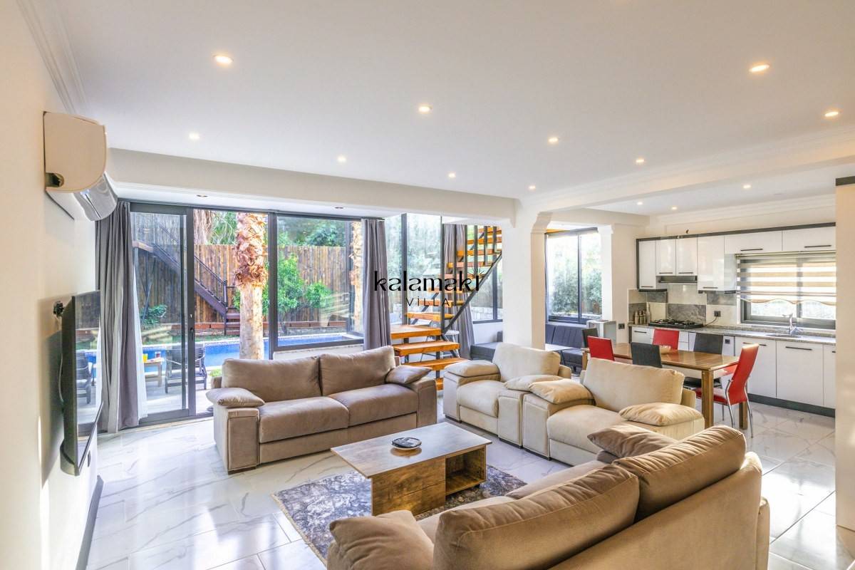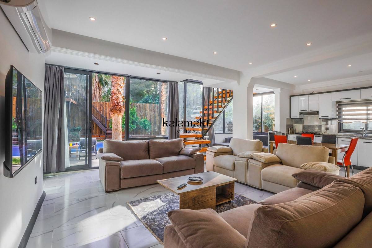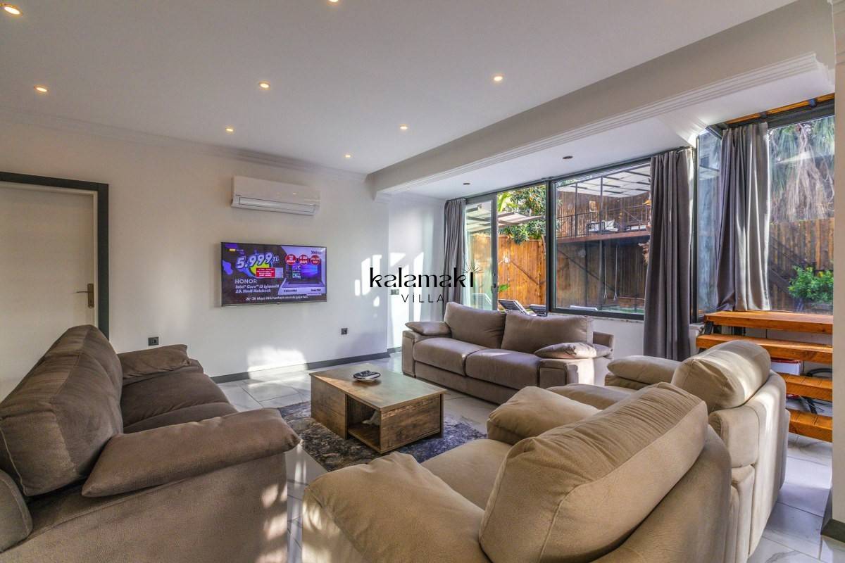 Salon: Oturma grubu, klima, televizyon, sehpa, uydu alıcı bulunmaktadır. Havuz terasına çıkış yapılabilmektedir.